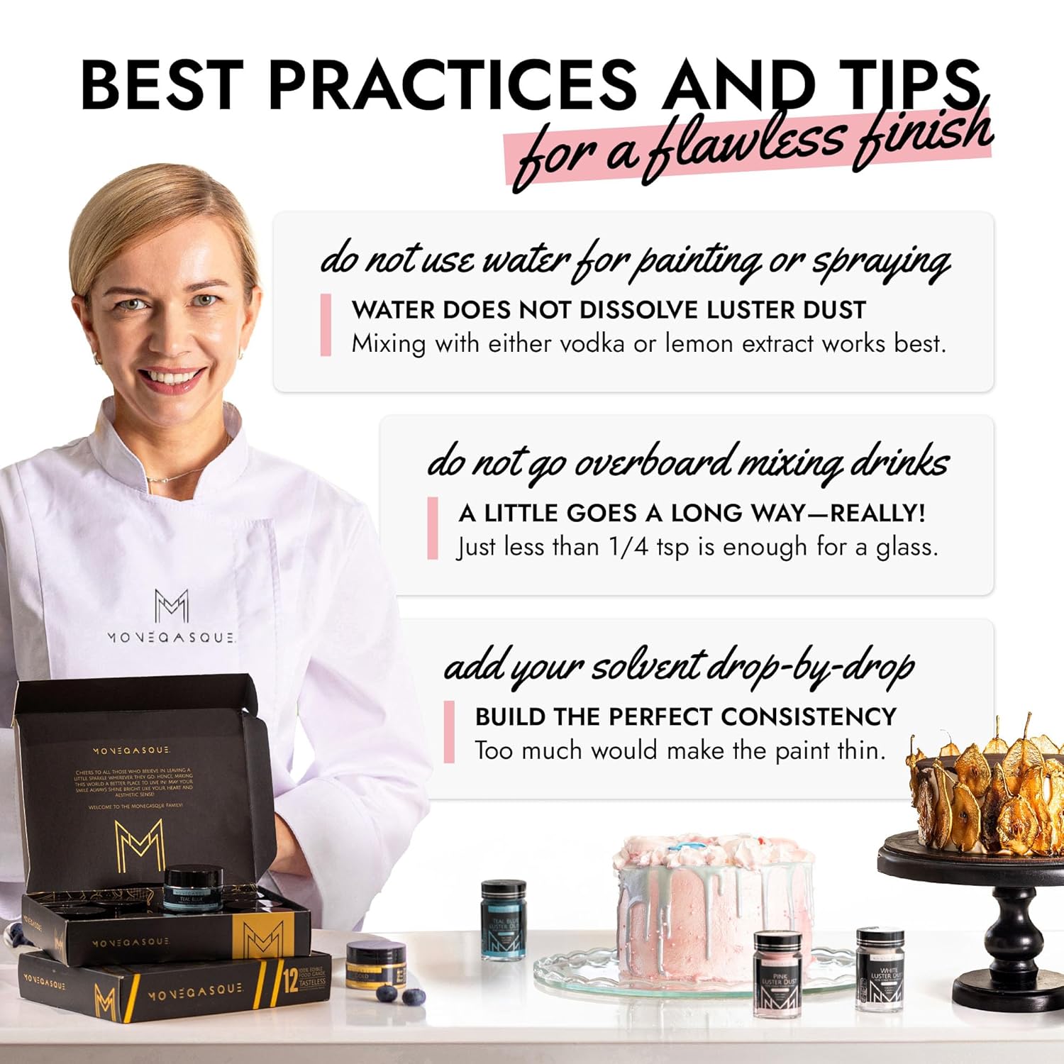 - EASY TO USE: Our pink luster dust is incredibly versatile. Apply with a wet brush, airbrush, or dry brush, and even mix into beverages. Achieve professional-looking results effortlessly at home, whether decorating halloween cakes or adding shimmer to cocktails.