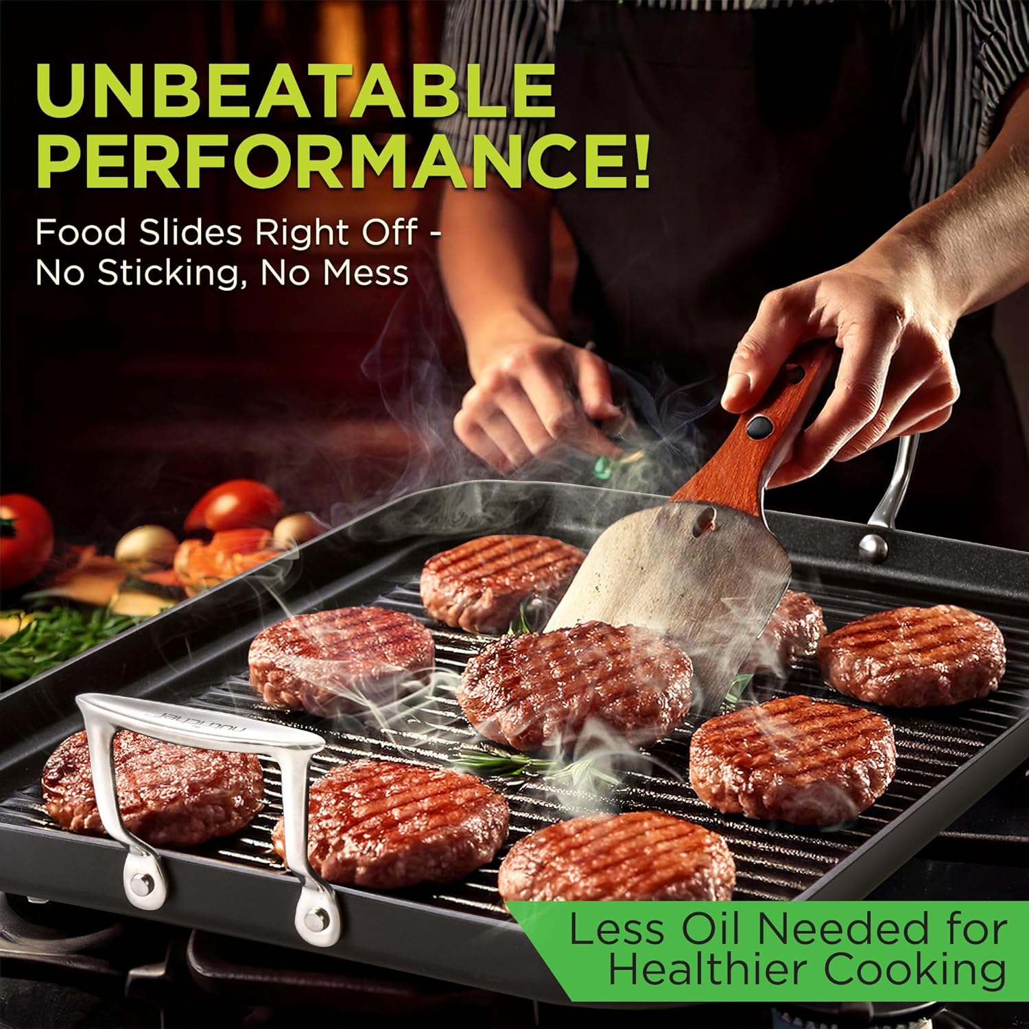 - NONSTICK COATING: The 20" x 13" nonstick grill pan cookware features a non-stick coated layer surface that ensures quick, effortless food release and eliminates the need for butter, oil, or cooking spray. Makes tasty homemade food slide out easily