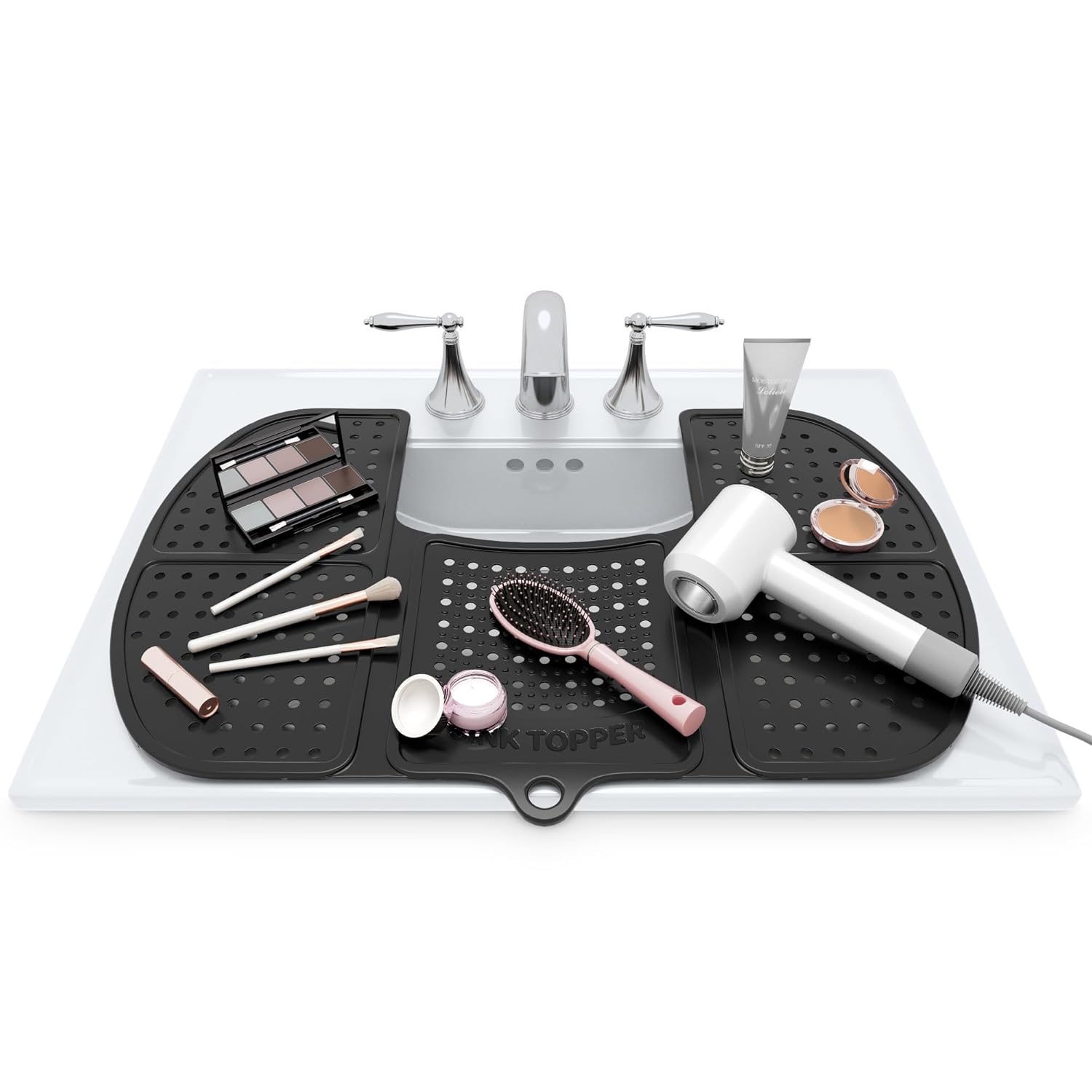 Sink Topper Bathroom Counter Cover & Storage Saver, Foldable Silicone Mat for Hot Tools, Hair Styling & Makeup, Beauty Brush Cleaning Mat, RV Camper Sink Cover & for Small Spaces (Large Black)