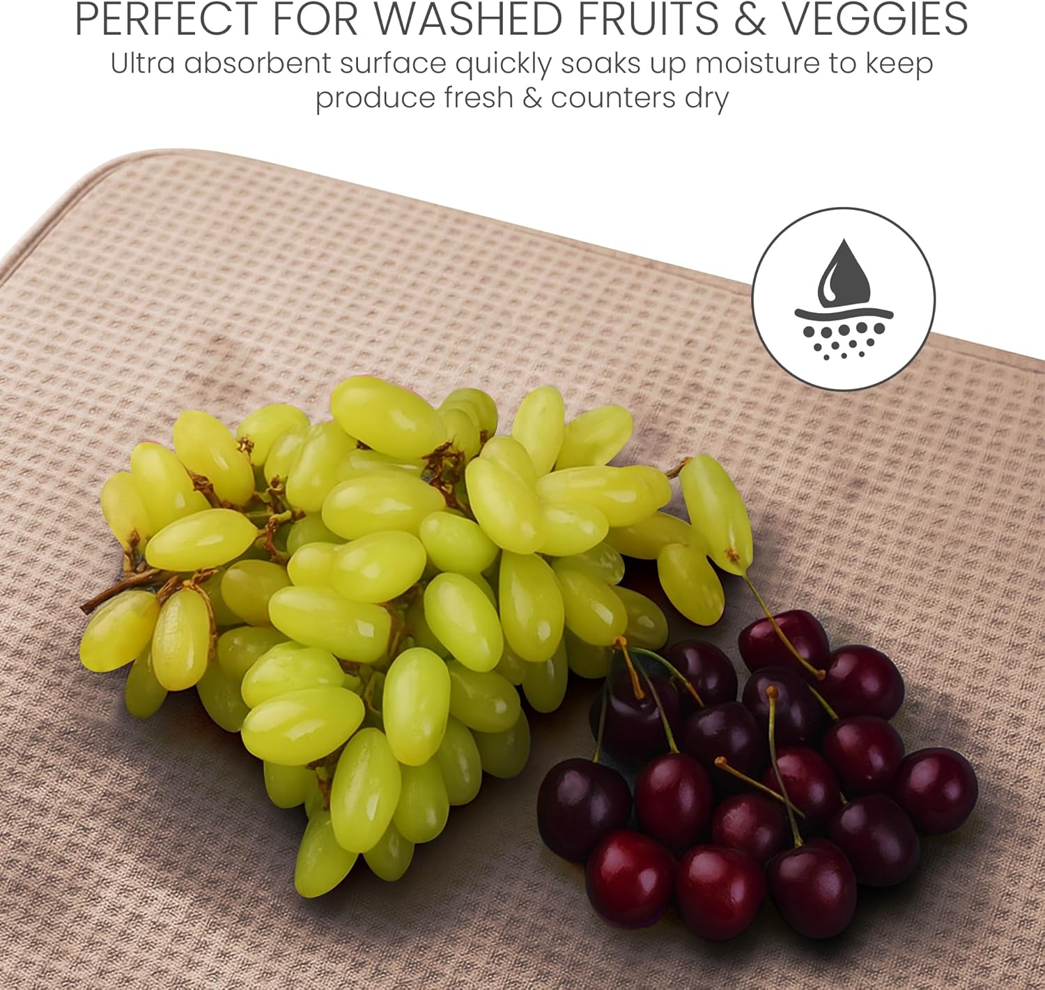 - THICKEST , STYLISH MAT | INNOVATIVE HONEYCOMB WEAVE: Keep your counter spotless even while washing a sink full of dishes . Our superbly stylish drying mat is among the thickest on the market today , and its innovative honeycomb microfiber structure enhances absorption and quickens drying time .
