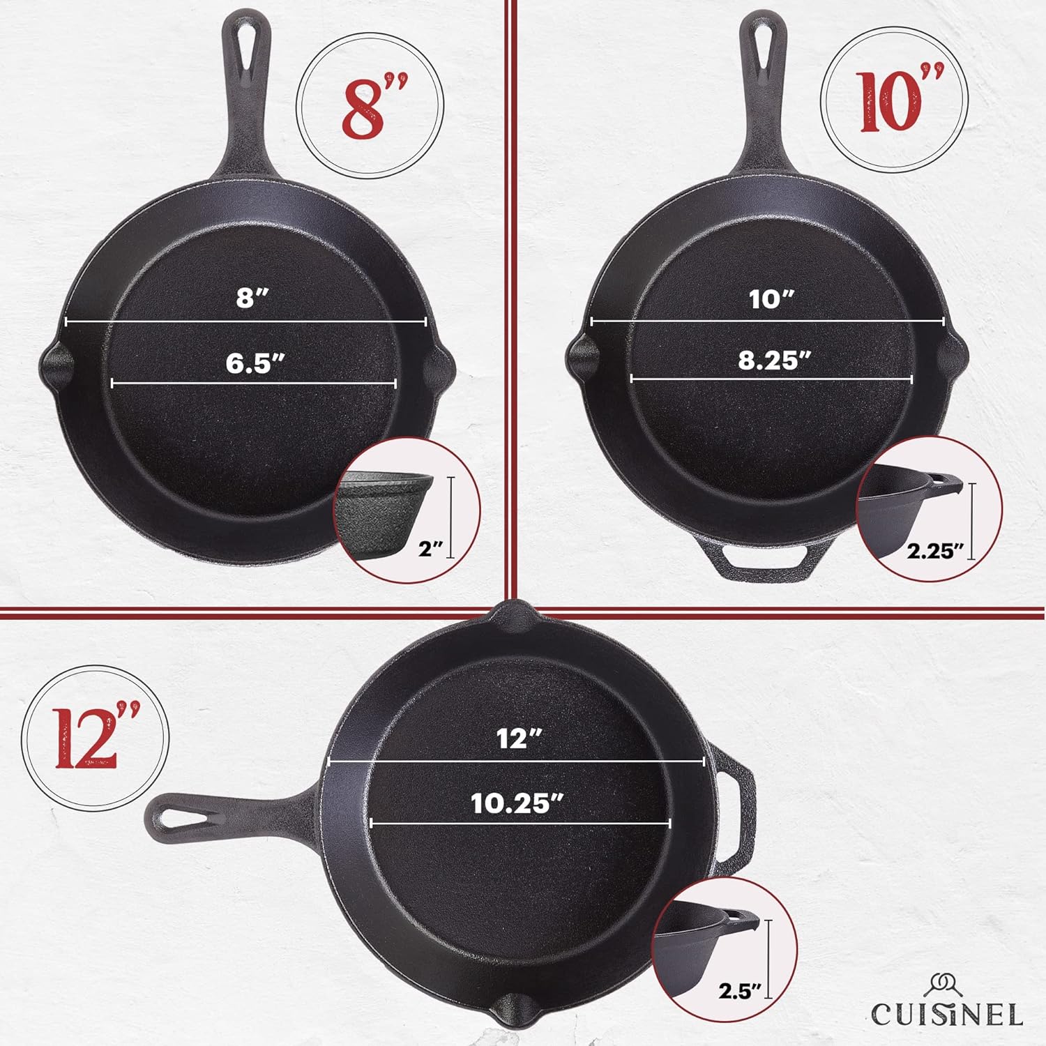 Cuisinel Cast Iron Skillets Set with Lids - 8"+10"+12"-inch Pre-Seasoned Covered Frying Pan Set + Silicone Handle and Lid Holders + Scraper/Cleaner - Use Cookware Indoor/Outdoor, Oven, Stovetop, Fire