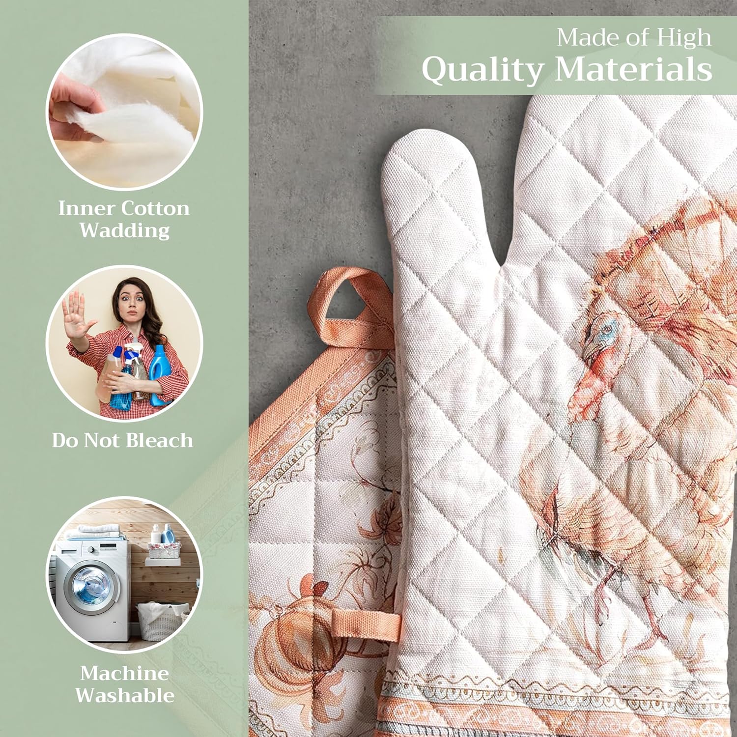 Maison d' Hermine 100% Cotton Oven Mitt & Pot Holder Set (7.5"x13" & 8"x8") Heat Resistant BBQ Cooking Gloves with Loop, Baking, Grilling, Kitchen, Handling Hot Pans (Giving Thanks)