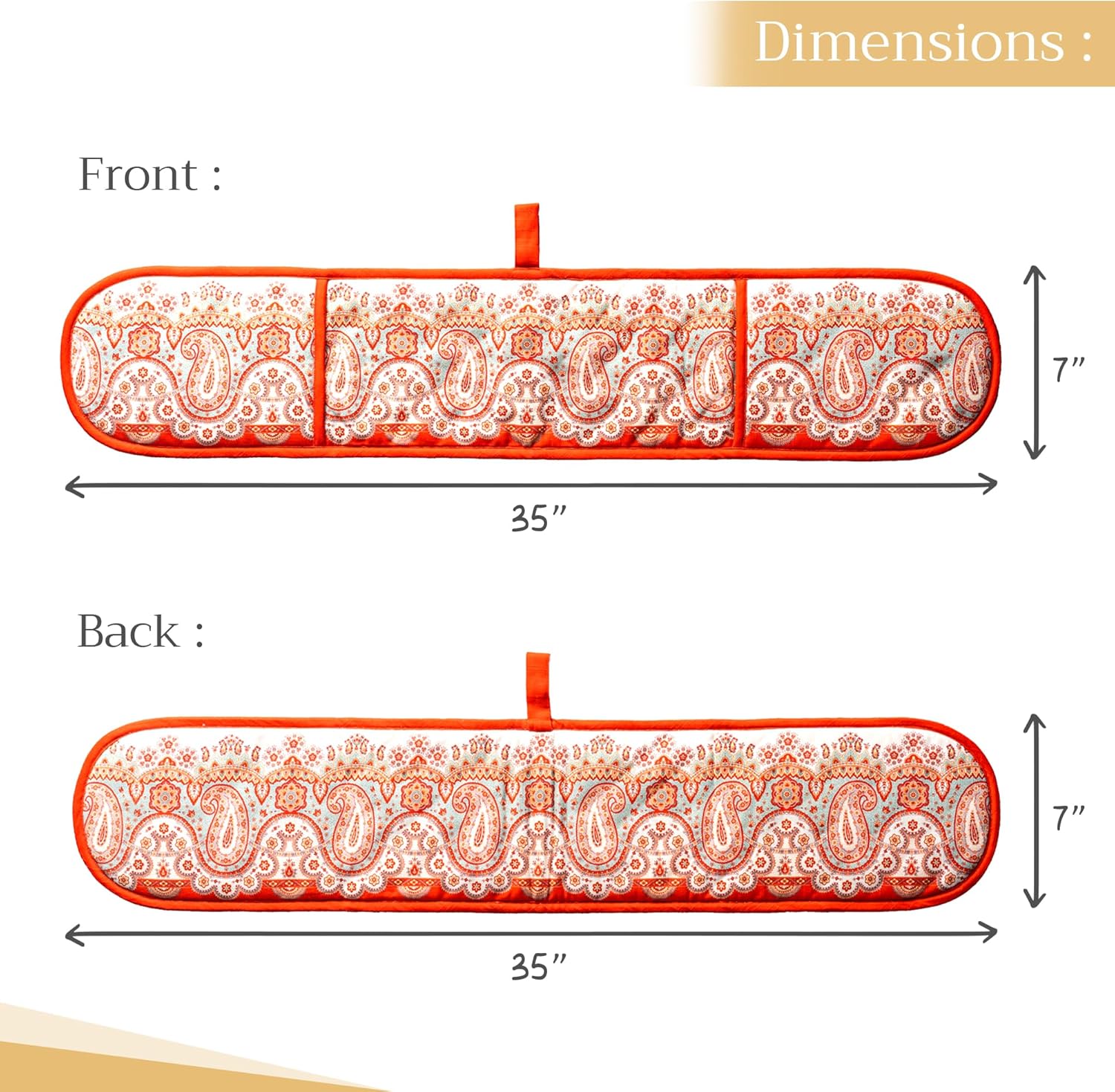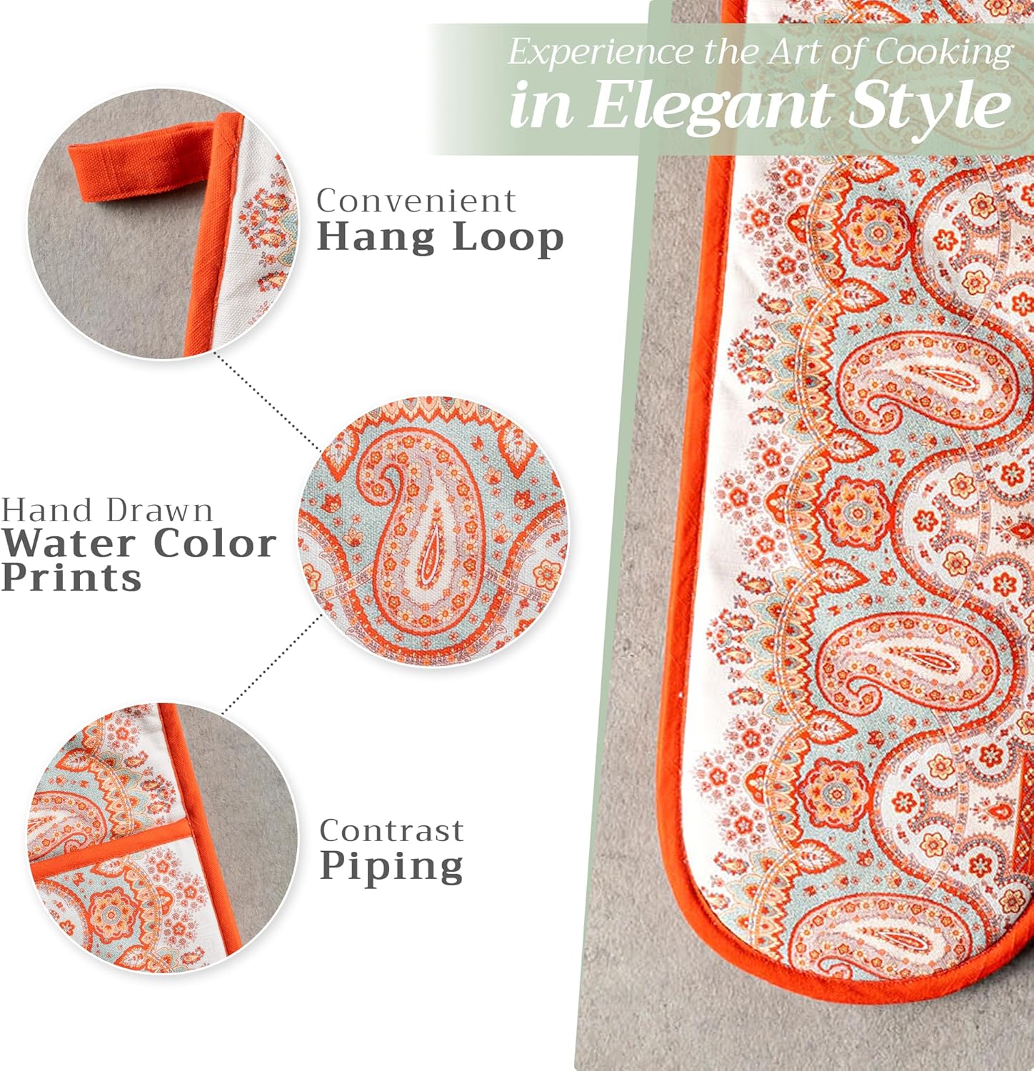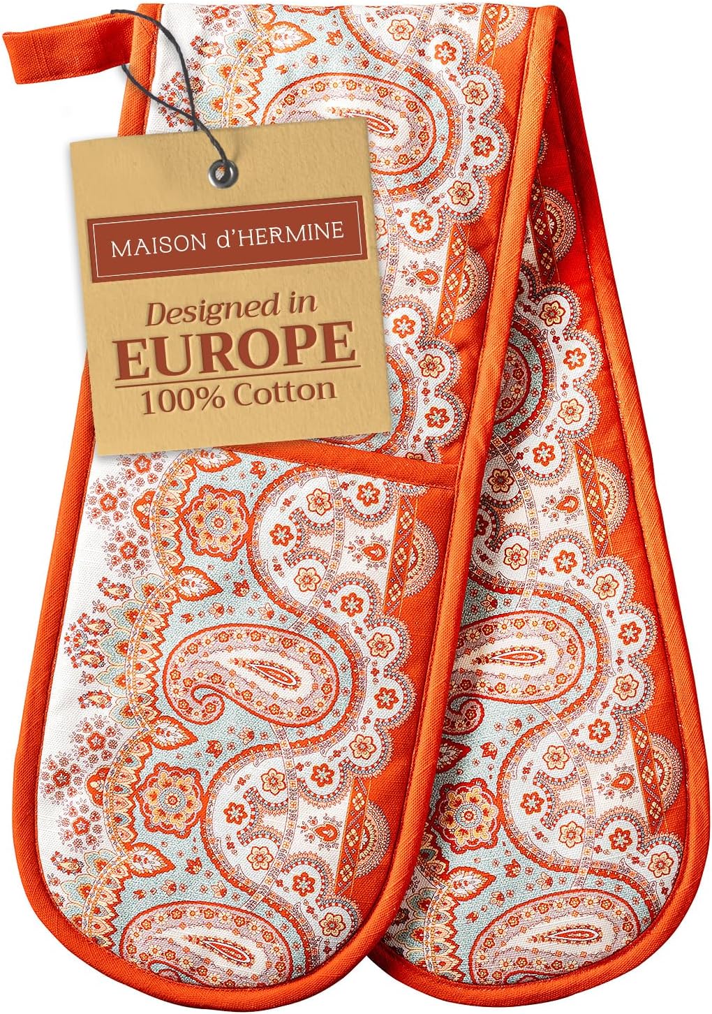 - Package includes: Includes 1 double oven mitt sized 7"x35". Perfect for handling hot cookware safely while adding a touch of European elegance to your kitchen. Designed in Europe and made in India with care