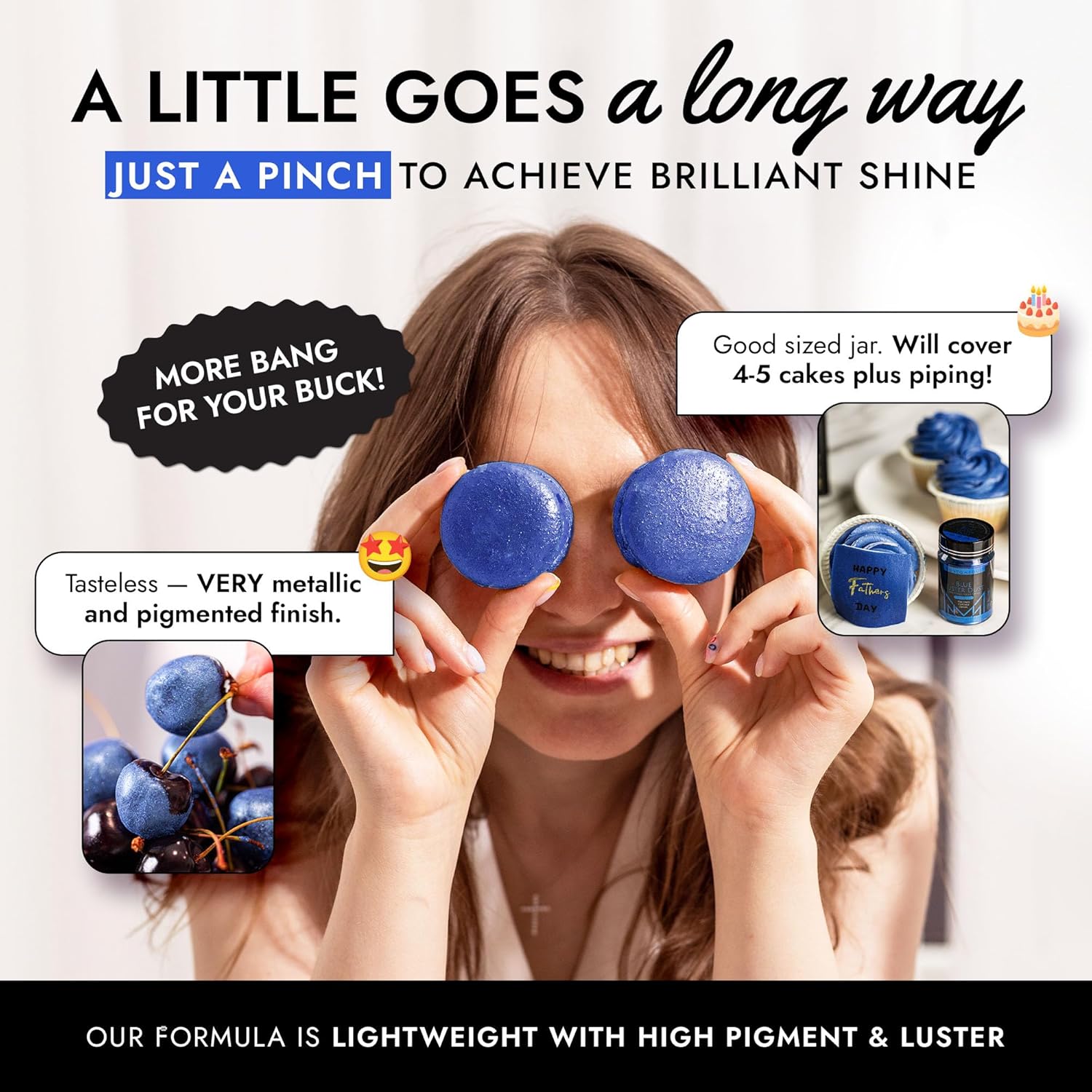 - EASY TO USE: Our blue luster dust is incredibly versatile. Apply with a wet brush, airbrush, or dry brush, and even mix into beverages. Achieve professional-looking results effortlessly at home, whether decorating cakes or adding shimmer to cocktails.