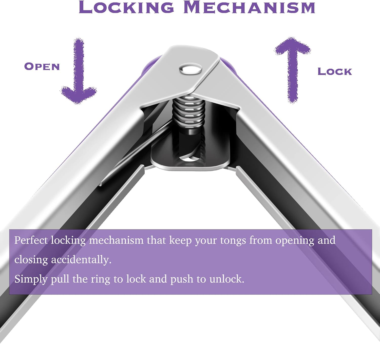Set of 2 Kitchen Tongs 9-Inch & 12-Inch, Premium Stainless Steel BPA Free Silicone Non-Stick Grilling Barbeque Cooking Locking Food Tongs, Purple
