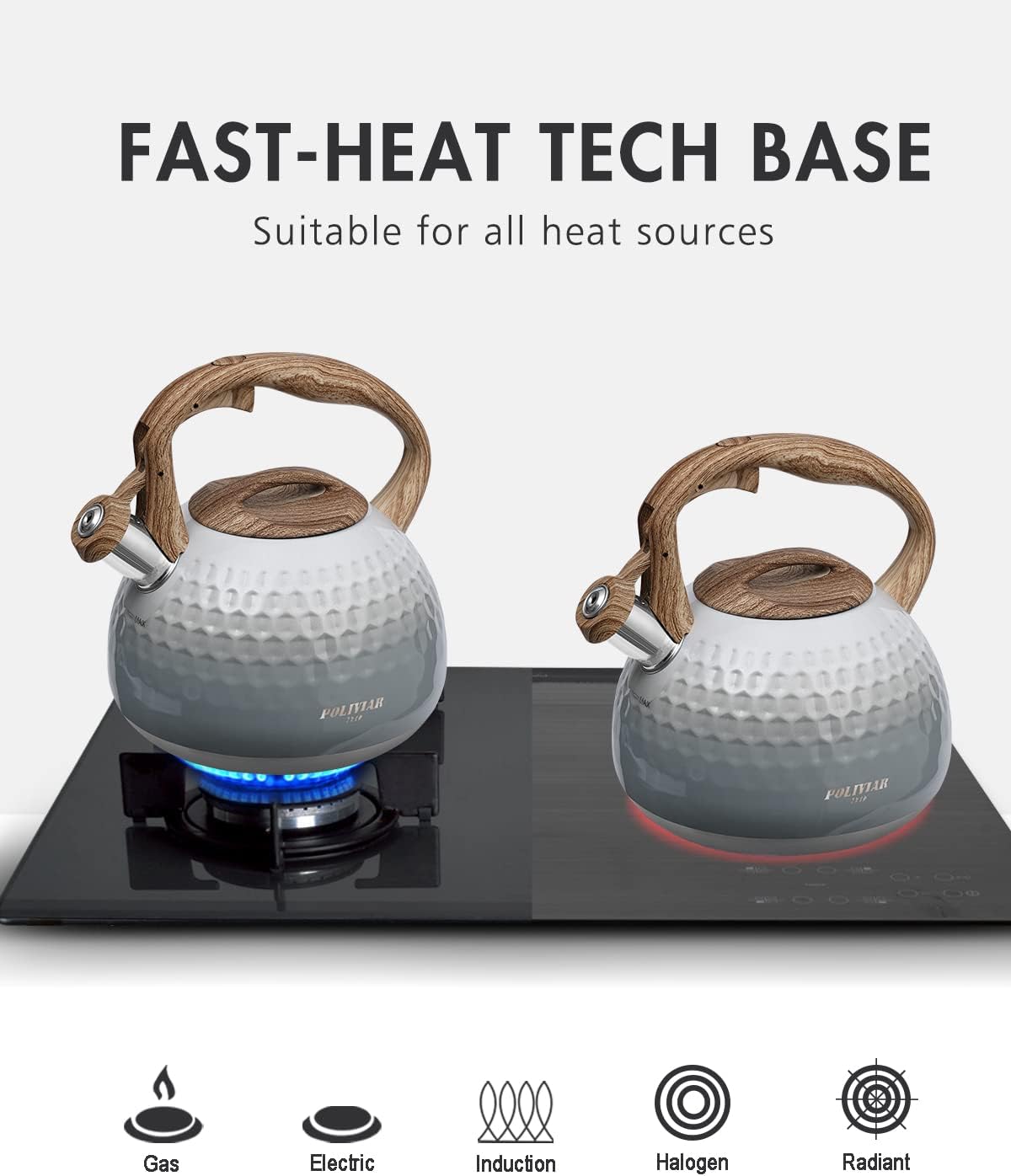 - Fast Heat Base - The tea kettle designed with a generous 8 in base can maximize the heat conduction to increase the efficiency of boiling. High grade stainless steel is suitable for any heat source including gas, electric and induction.