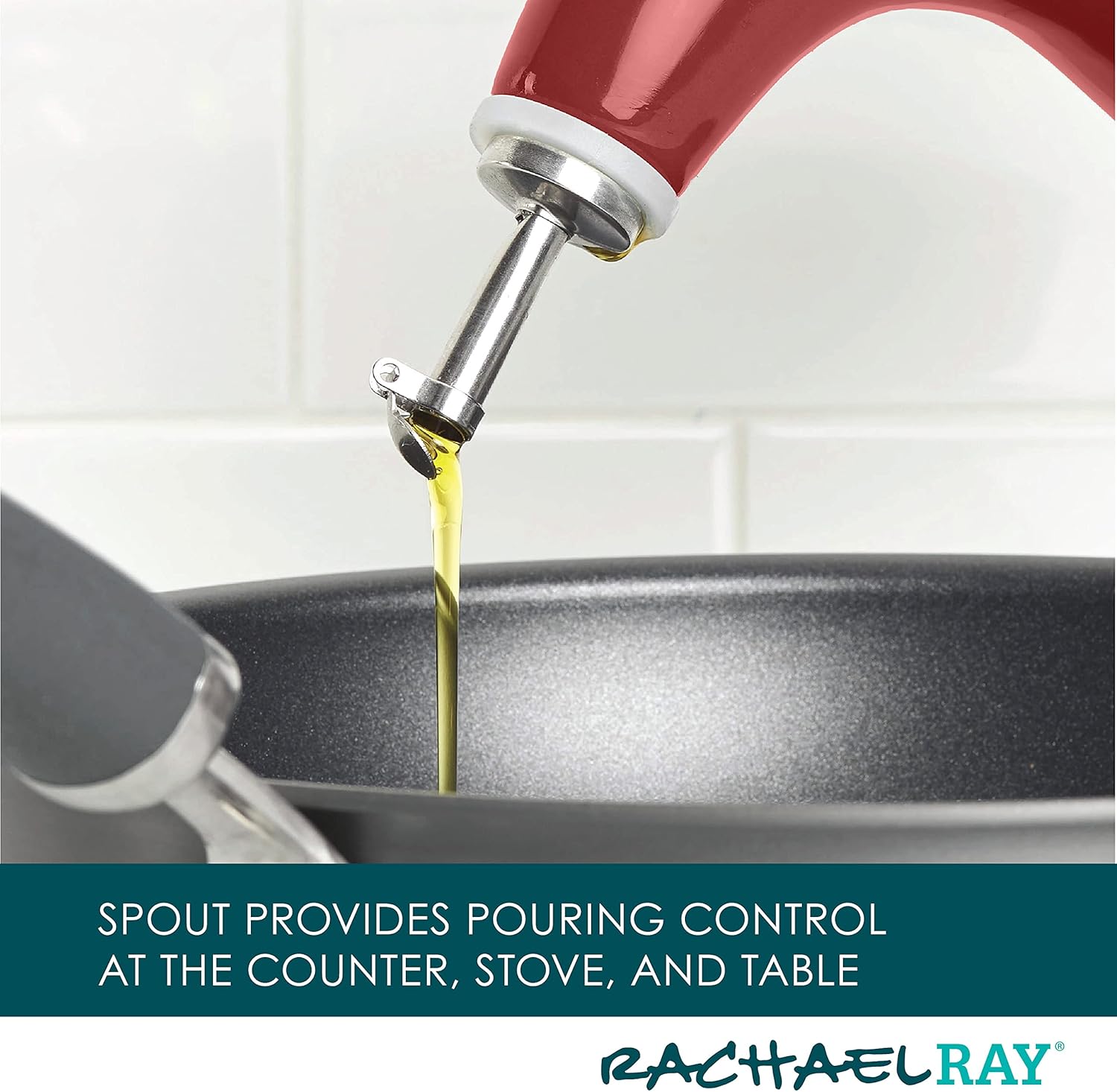 - PRECISION POUR: Rachael Ray EVOO bottle is ideal for use as a cruet and salad dressing duspenser and features unique spout designed for perfect pouring of oil and vinegar