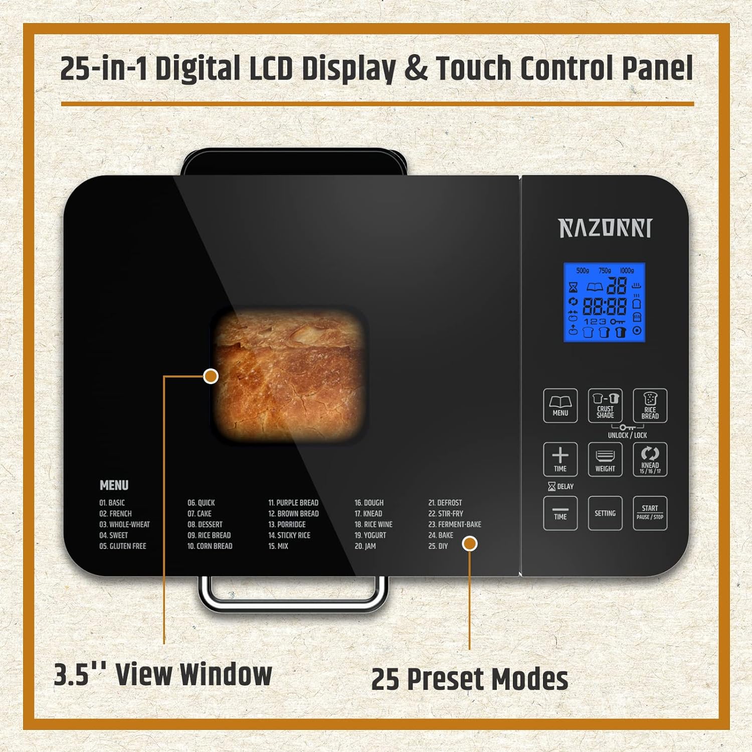 - 25 Presets and DIY Functions: 25 preset programs for all kinds of bread to fulfill your daily diets, including basic kinds bread, dessert, and single function for knead, defrost, ferment and bake, etc. And you may also customize based on your favorite taste.