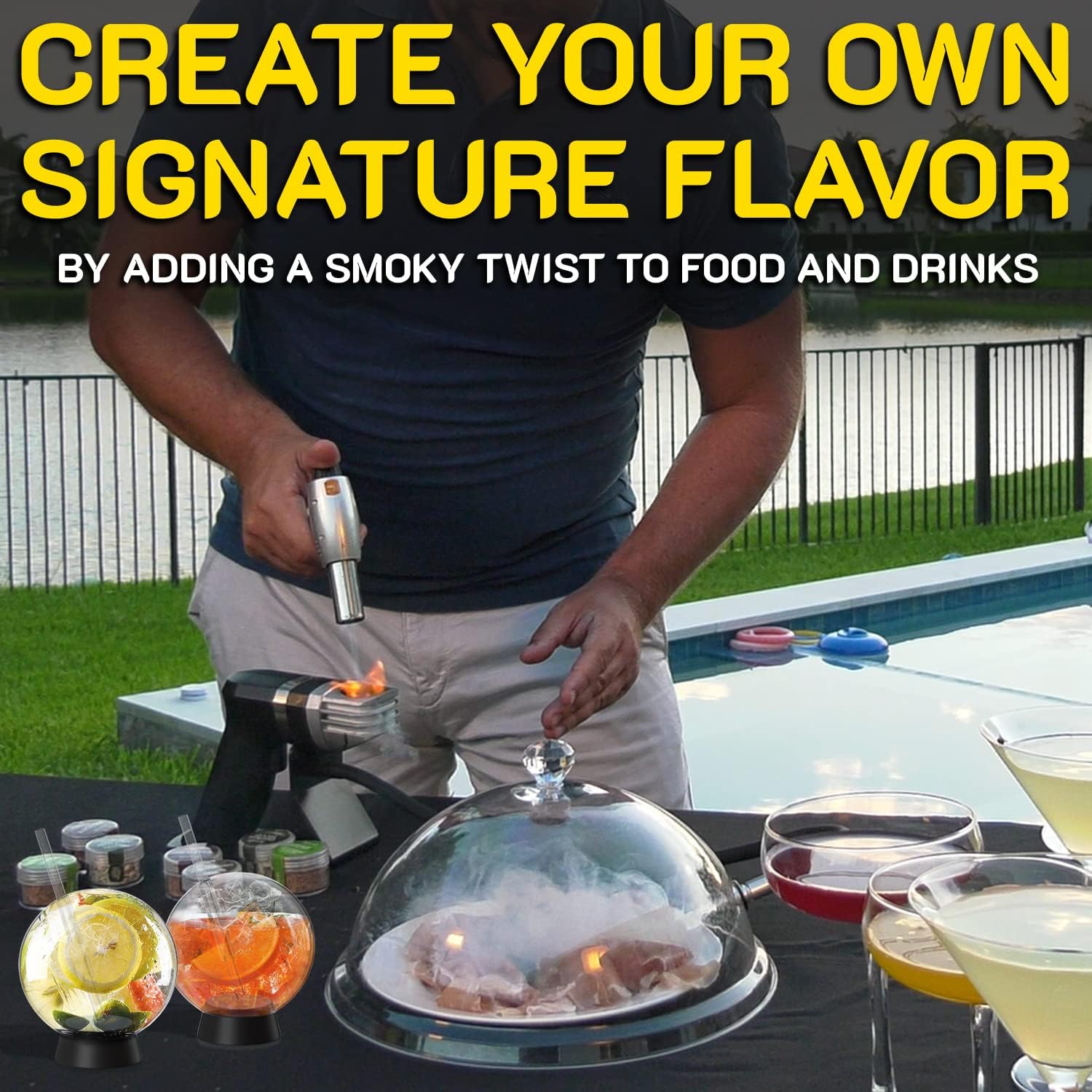 - ✔ COMPLETE COCKTAIL SMOKER SET - Premium Kit Included 13 PCS - You get SMOKING GUN, convenient Stand, Flexible hose, Disk LID, DOME lid (cloche), 2 Glass Cocktail Ball, 4 flavors of WOOD CHIPS, Nozzle for Bubbles, 4 x AA batteries, 3 extra mesh, tweezers for cleaning brush, screwdriver. Ready to use out of the box! (Bubble Mixture NOT included)