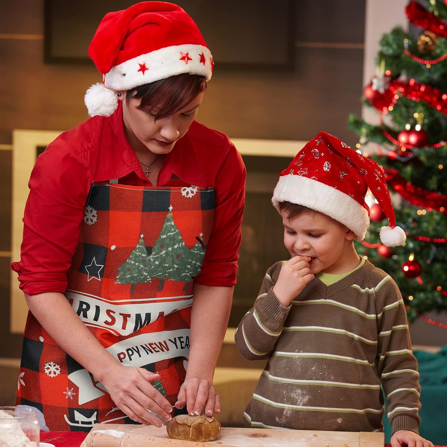 - Christmas theme elements: these kitchen aprons are based on the buffalo plaid patterns, printed with snowflakes, retro trucks, bells, garlands and the letters of [Christmas Party] and [Joy], the bright colors and rustic elements are suitable for you to use at Christmas party