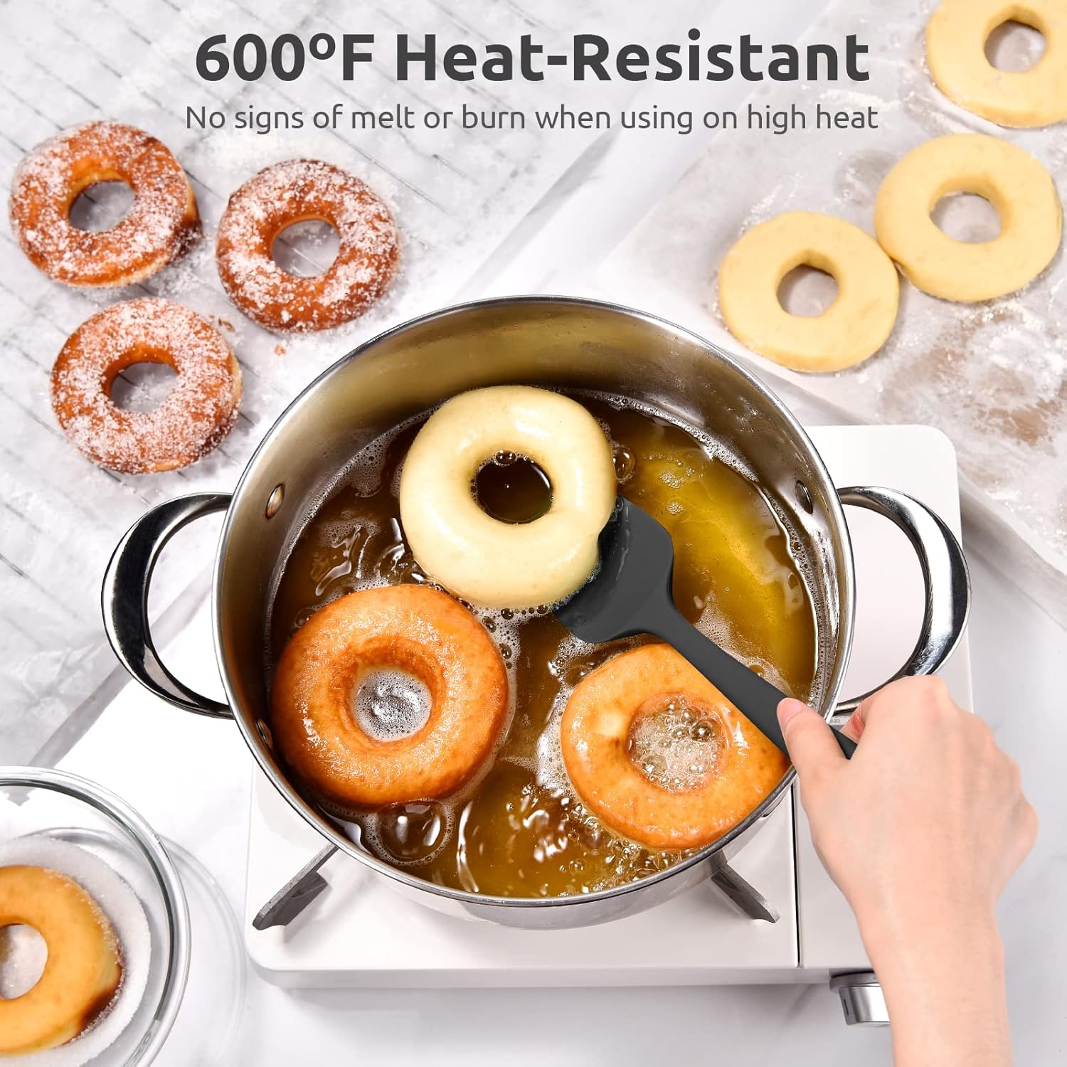 - [600ºF Heat-Resistant for High Heat Cooking] With up to 600 degrees heat resistance, you can use this nonstick silicone spatula in a hot pan without worrying about melted plastic in your dinner. It also works well with high temp sugars, chocolates or sauces. A must for newer cooks who might tend to leave utensils in a nonstick pot while cooking. You can use this heat safe silicone scraper daily for everything from stirring to frying to smoothing.
