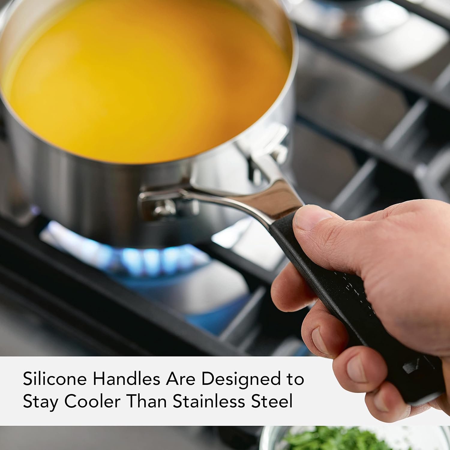 - SILICONE GRIP HANDLES: Dual riveted handle is finished with a silicone grip to remain cooler while cooking on the stovetop