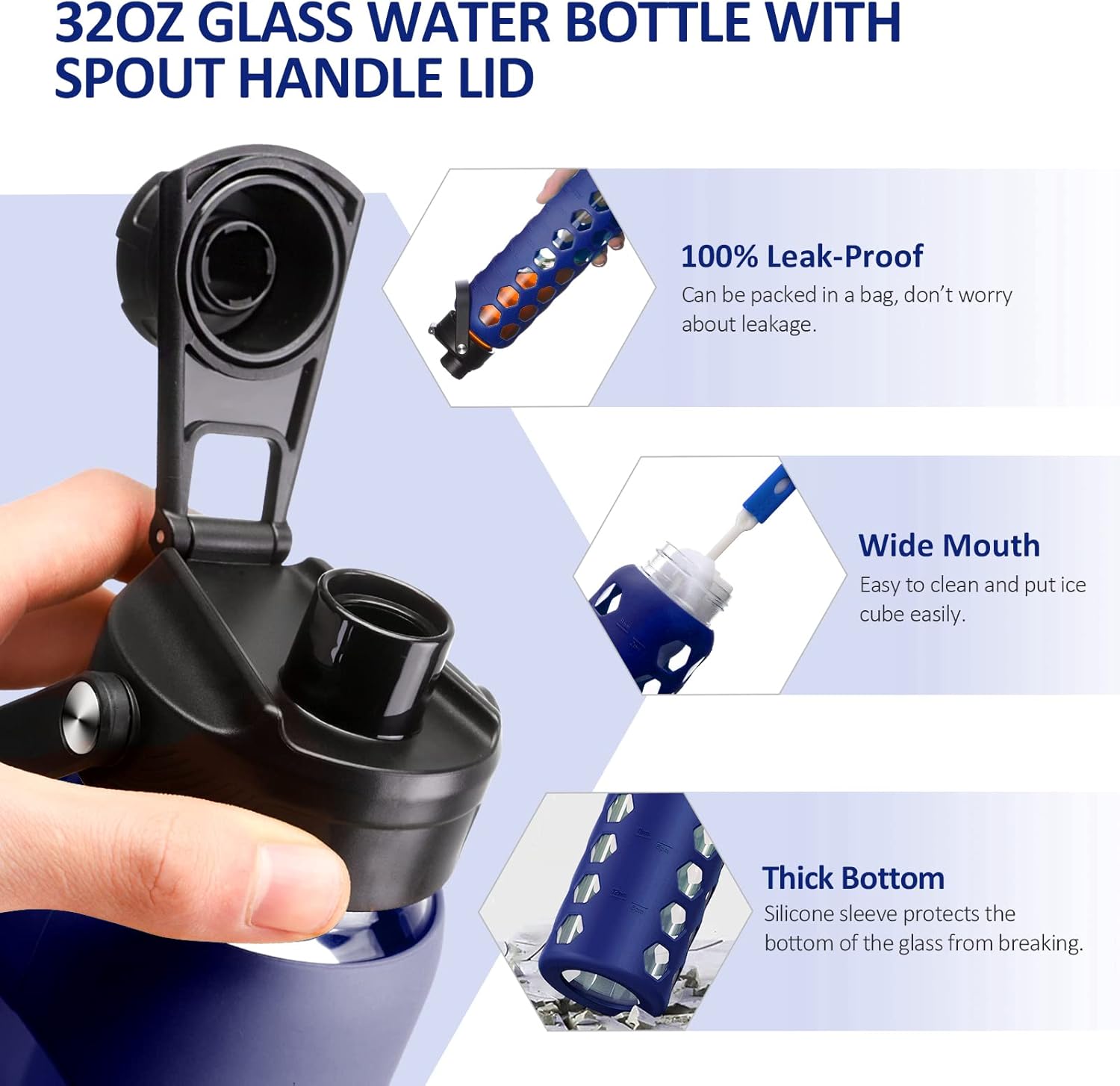 MUKOKO 32oz Glass Water Bottles with 2 Lids-Handle Spout Lid&Bamboo Straw Lid, Motivational Water Tumbler with Time Marker Reminder and Silicone Sleeve, Leakproof-Blue-1 Pack