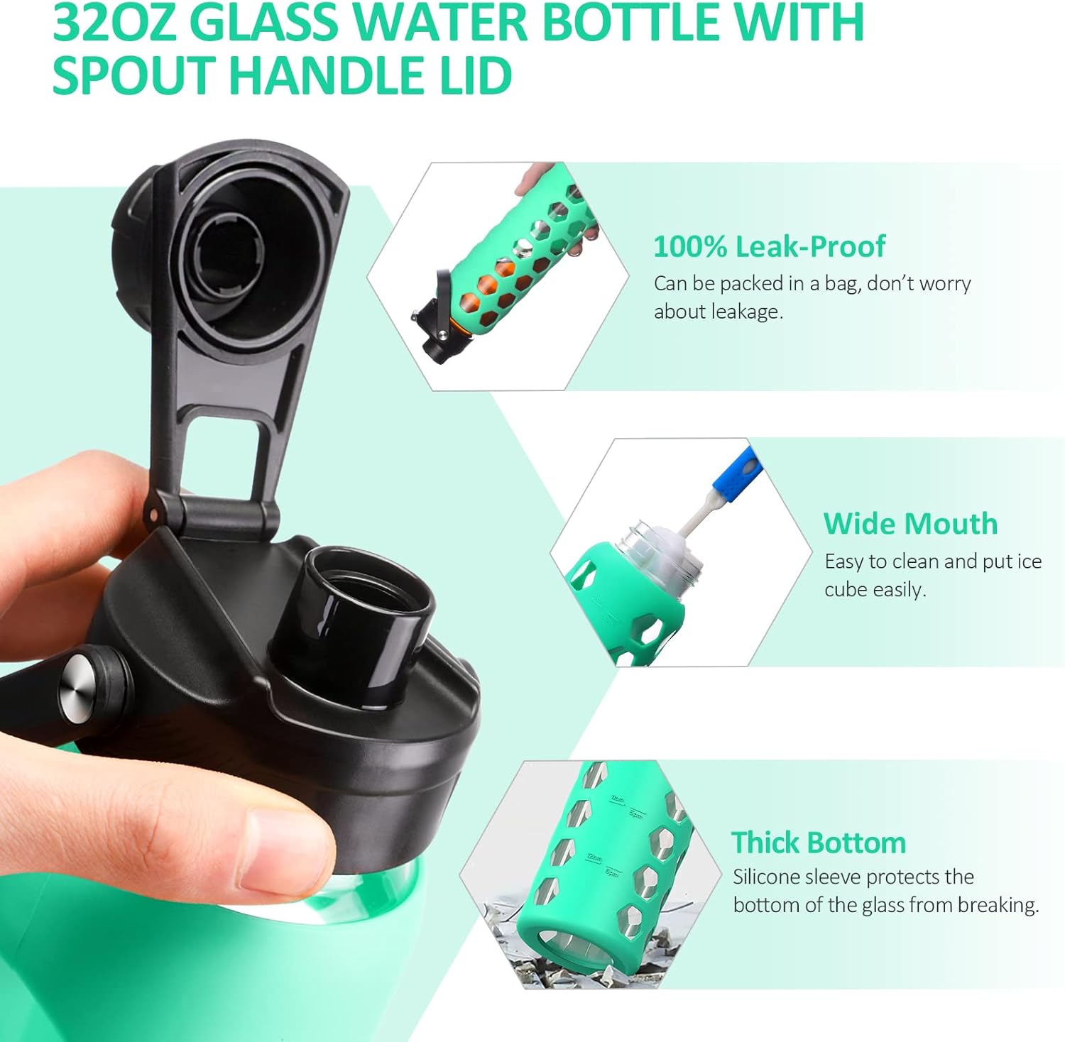 MUKOKO 32oz Glass Water Bottles with 2 Lids-Handle Spout Lid&Bamboo Straw Lid, Motivational Water Tumbler with Time Marker Reminder and Silicone Sleeve, Leakproof-Green-1 Pack