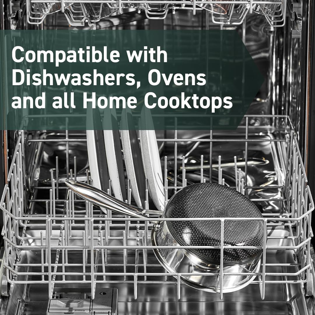 - Tri-ply construction with an aluminum core for quicker even heating, it’s safe to use on any home cooktop or stovetop, including induction. HexClad is metal utensil-safe, dishwasher-friendly, and oven-safe up to 900°F. (Tempered glass lids are oven-safe up to 400°F, while stainless steel lids are oven-safe up to 900°F.)