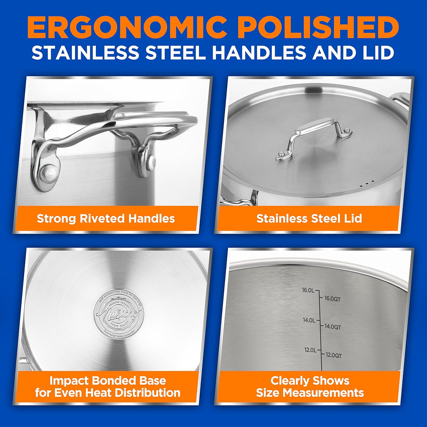 - 16 QUARTS:The NutriChef Stainless Steel Large Cooking Pot features 16-quart capacity weighing 6.55 lbs w/ lid which is the perfect size for boiling eggs, simmering stocks & soups or making sauces for a large crowd.Great for commercial & home cooking