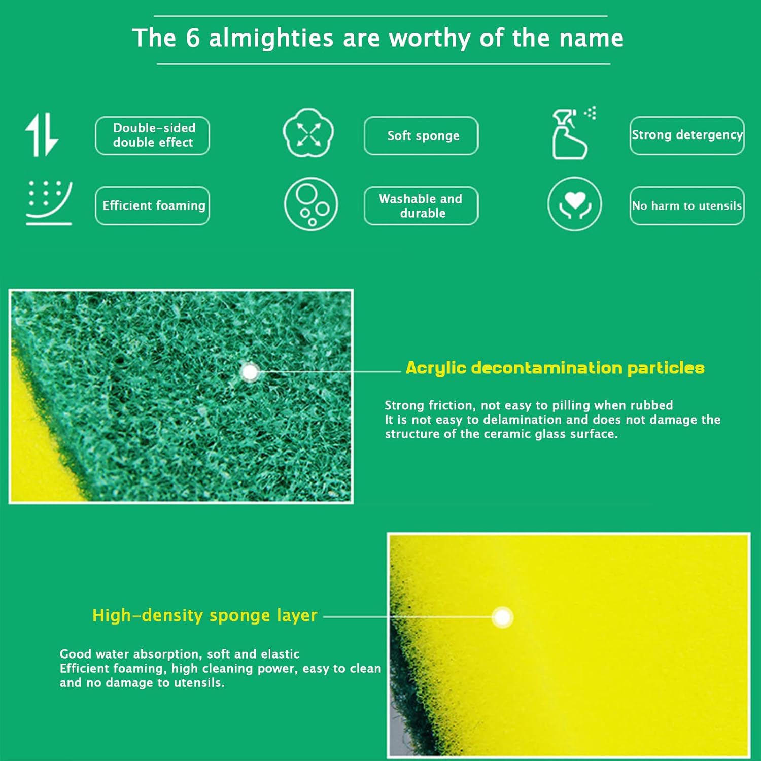- ★ Make Your Housework Easier: The green scrub side contains decontamination particles special grinding factor, durable and strong decontamination that can helps to tackle tough chores. The non-scratch soft yellow sponge side with good water absorption, suitable for scrubbing light oily tableware, fast cleaning without scratching.