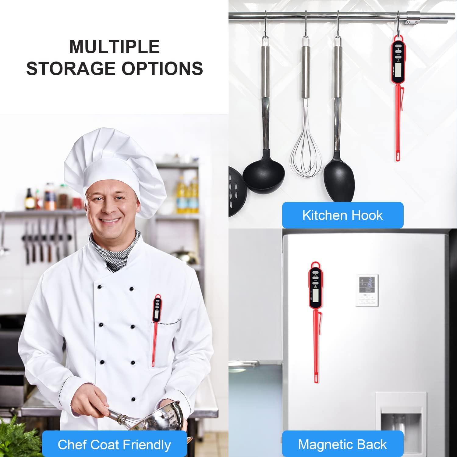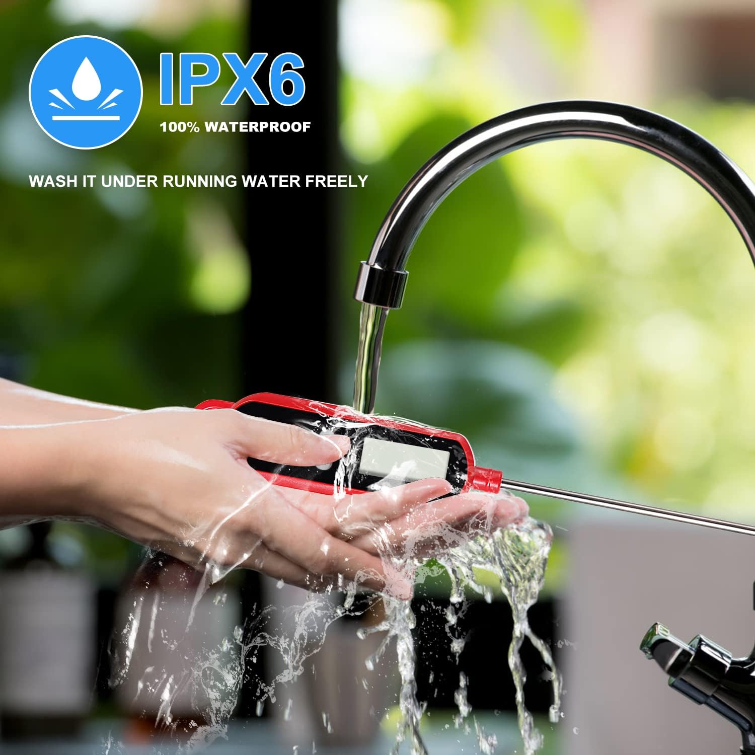 - WATERPROOF & LONG PROBE - Cooking thermometer with IPX6 rated waterproof, clean it freely under running water. Keep you away from hot food safely with 5.1 inch food grade long probe, pocket sleeve clip included