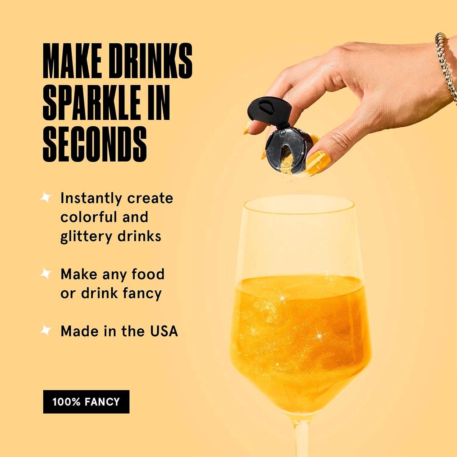 - GLITTERY FOOD & DRINKS: Fancy Edible Glitter is a fine prismatic powder formulated for both food and drink. Add edible glitter to still and carbonated beverages and spirits to create a glittery hurricane, or dust onto desserts and savory items for a sparkly finish.