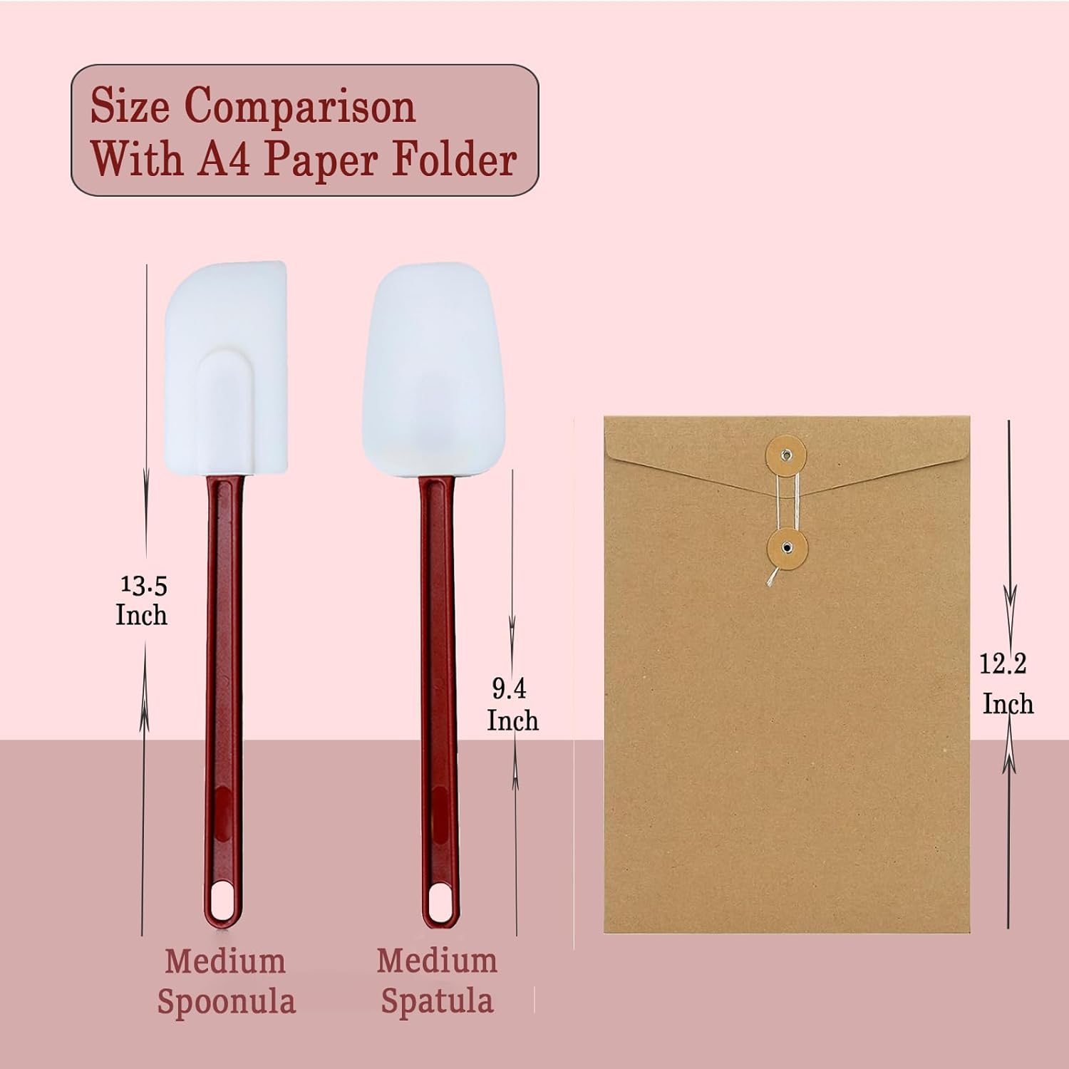 - 【Silicone Spatula Set】 The product contains two silicone spatulas, one is flat and one is spoon type head, which can fit any shape of container. There are three different sizes of 9.5"/13.5"/16.5" for you to choose from, which can meet your different needs. The 9.5" rubber spatula can be used in your bowl, the 13.5" is suitable for frying and cooking, making cakes in a family of 3-5, and the 16.5" can be used in large containers, such as large pots and pans in commercial kitchens