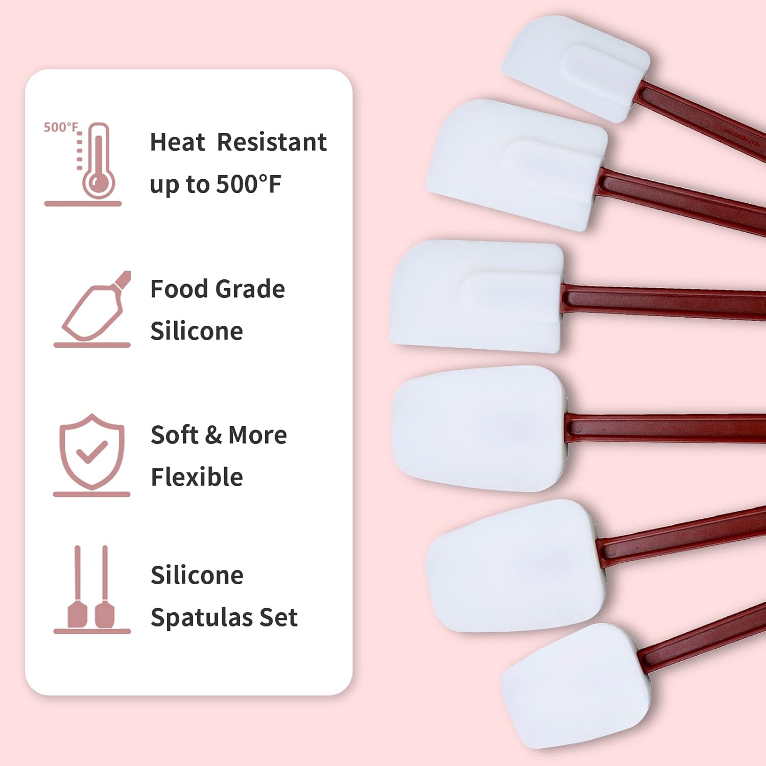- 【Quality Material】 This silicone spatulas are made of 100% food-grade silicone blade and nylon handle, can withstand temperatures up to 500 degrees Fahrenheit. This spatula does not stain or fade or discolor, is odorless, durable, and will not crack when used in high temperatures. Meets NSF standards, 100% food safe