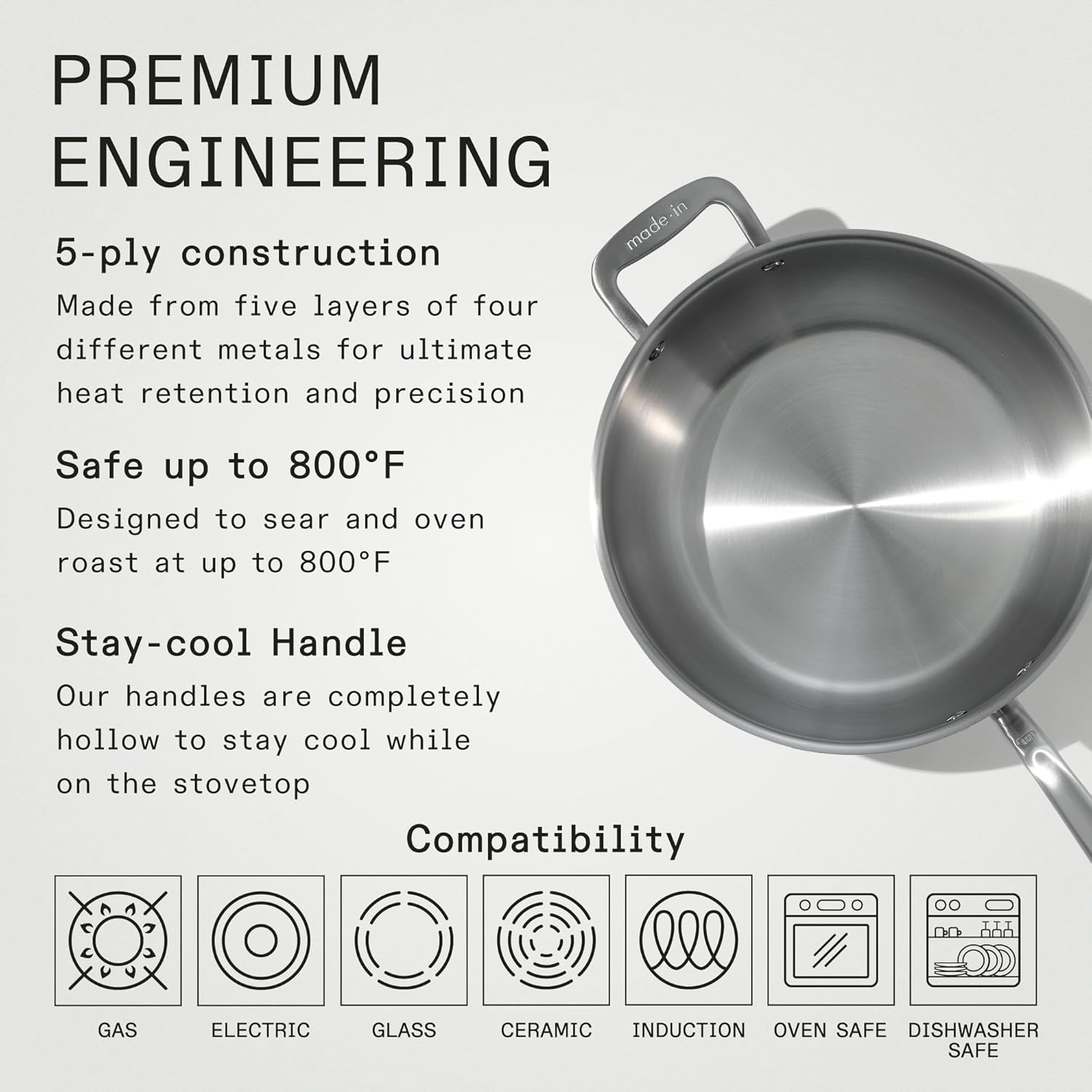 Made In Cookware - 5 Quart Stainless Steel Saucier Pan - 5 Ply Stainless Clad - Professional Cookware - Crafted in Italy - Induction Compatible