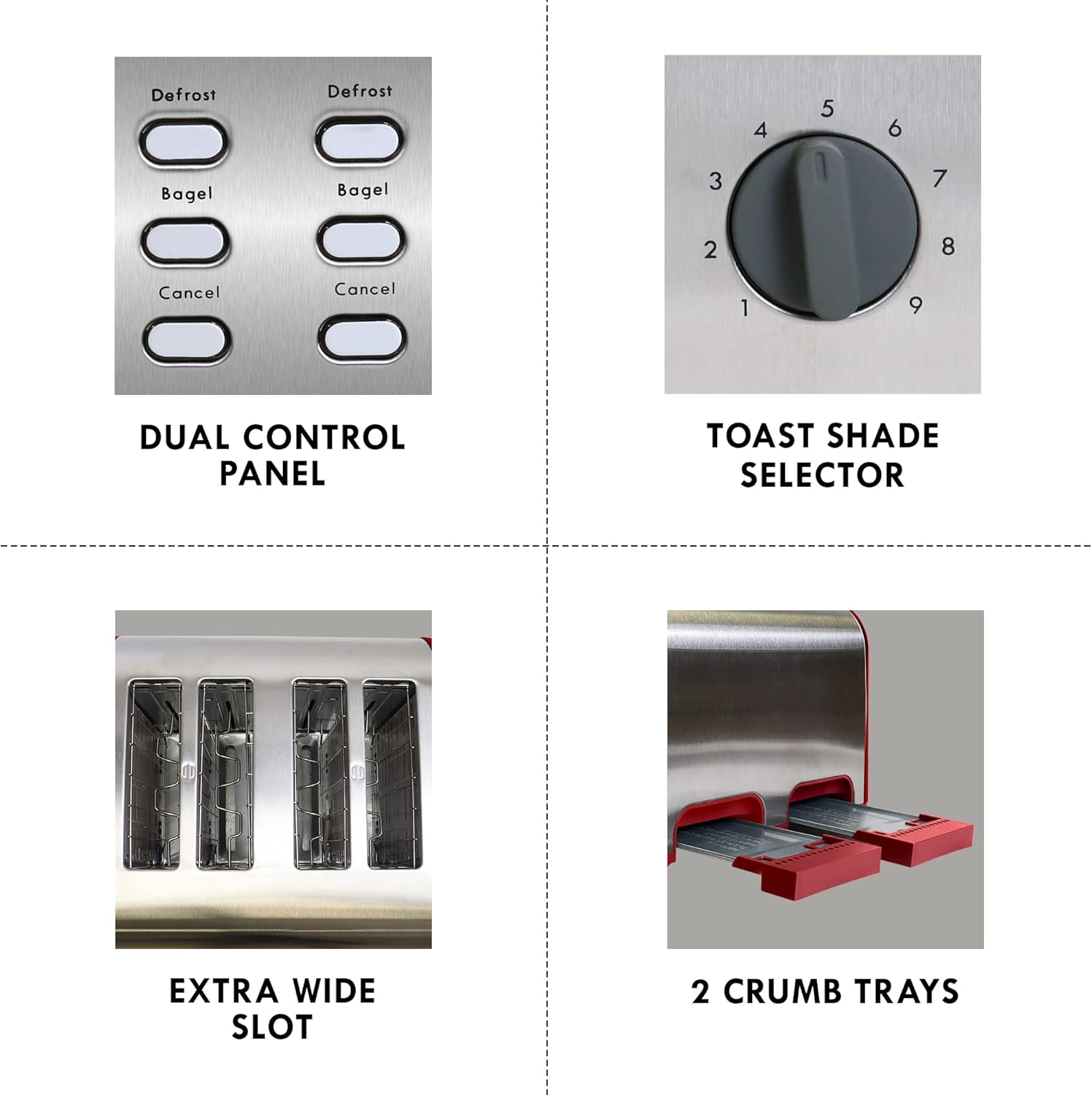 - EASY CLEANUP AND MAINTENANCE: Keep your kitchen looking sleek and stylish with the stainless steel housing. It's not just a pretty face—cleaning is a breeze with separate, removable BPA-free crumb trays. Enjoy hassle-free maintenance and a spotless kitchen, all while adding a touch of modern elegance to your countertop.