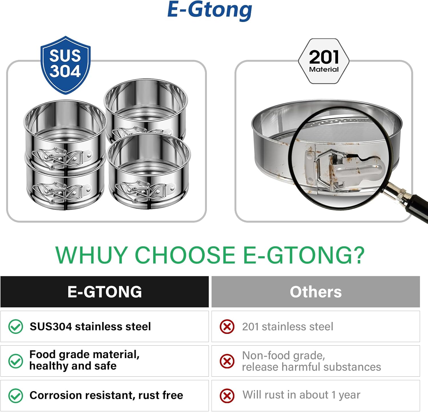 - TOXIN-FREE & SAFE MATERIAL- E-Gtong Cake Pan Set is Made of the High Quality 304 Stainless Steel, Strong and Durable, Rust-Free, No Black Coating Material Peeling off, BPA Free, Heat-resistance.