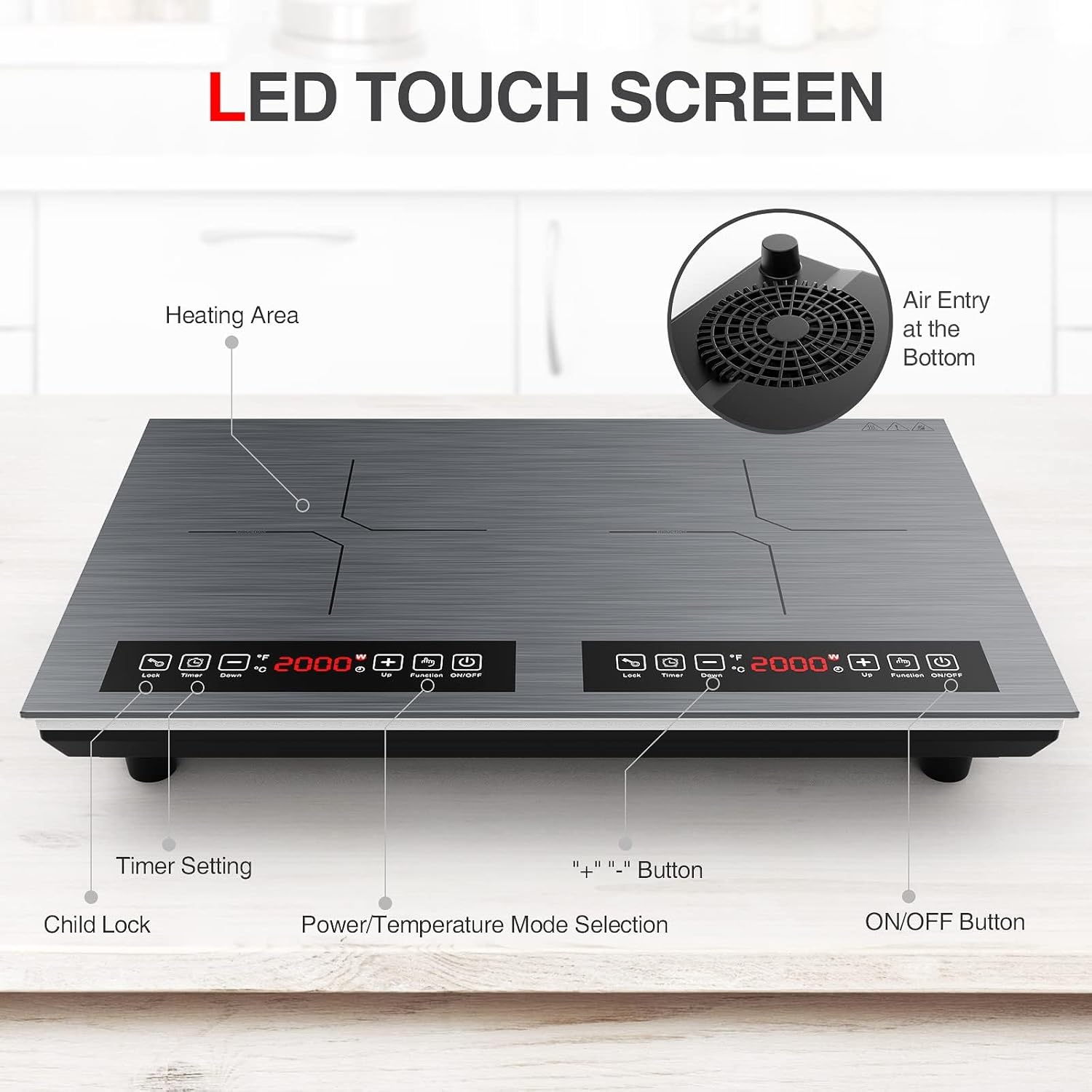 - DUAL HEATING ZONES:The double induction cooktop features two independent heating areas and independent LED display. Each burner is 2000W which can cook 2 dishes quickly at the same time. The electric cooktop uses 110v-120v of electricity standard in all North American homes. The induction burner countertop is lower noise than others and more energy saving.