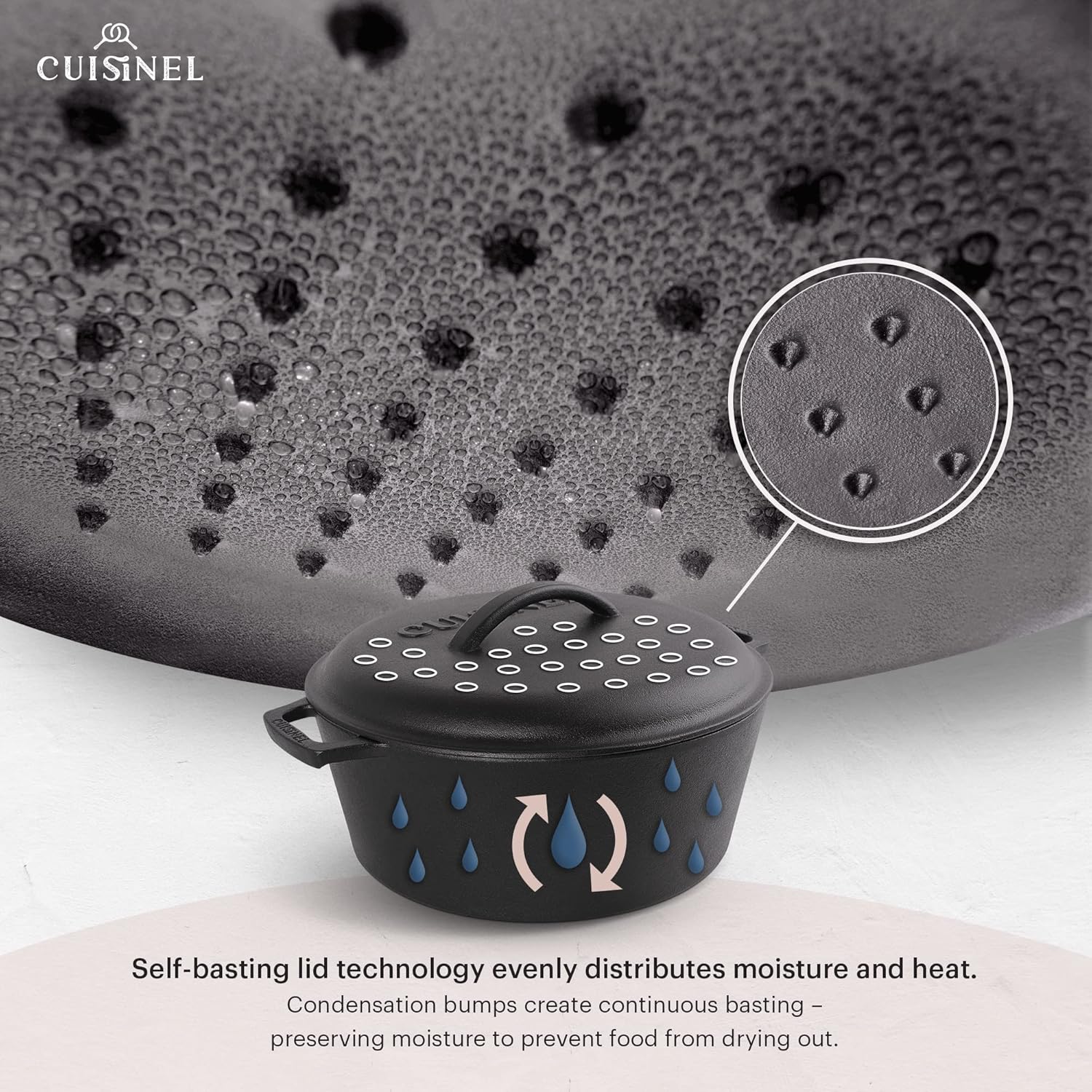- THE DUTCH OVEN - NOW WITH A HEAVY DUTY CAST IRON BRAISER LID – With its meticulously placed drip-points - along with even moisture and heat distribution - effectively turns your pot into a casserole or braiser for evenly cooked results. Cooker and cover can withstand any temperatures without fear of shattering or cracking.