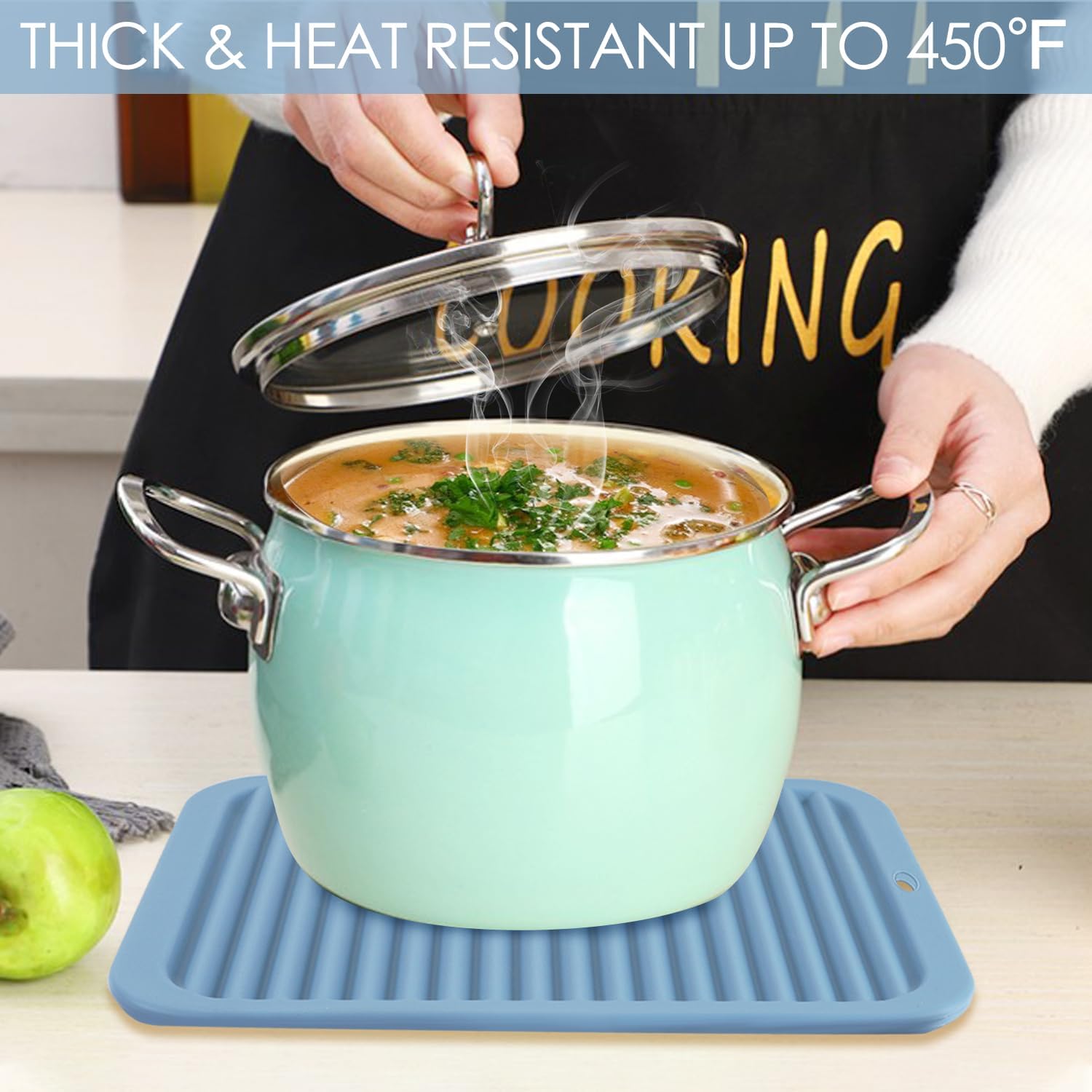 - HEAT RESISTANT TRIVETS MAT: The large blue silicone hot pads are great for countertops & hot Items, the heat resistant trivets mat set of 2 can withstand cold and hot temperatures from -104℉ to 446℉ (-40℃ to 230℃). Reliable design helps protect quartz counter tops from hot pots, pans, drips, and spills. Help tremendously when we cook in multiple steps!