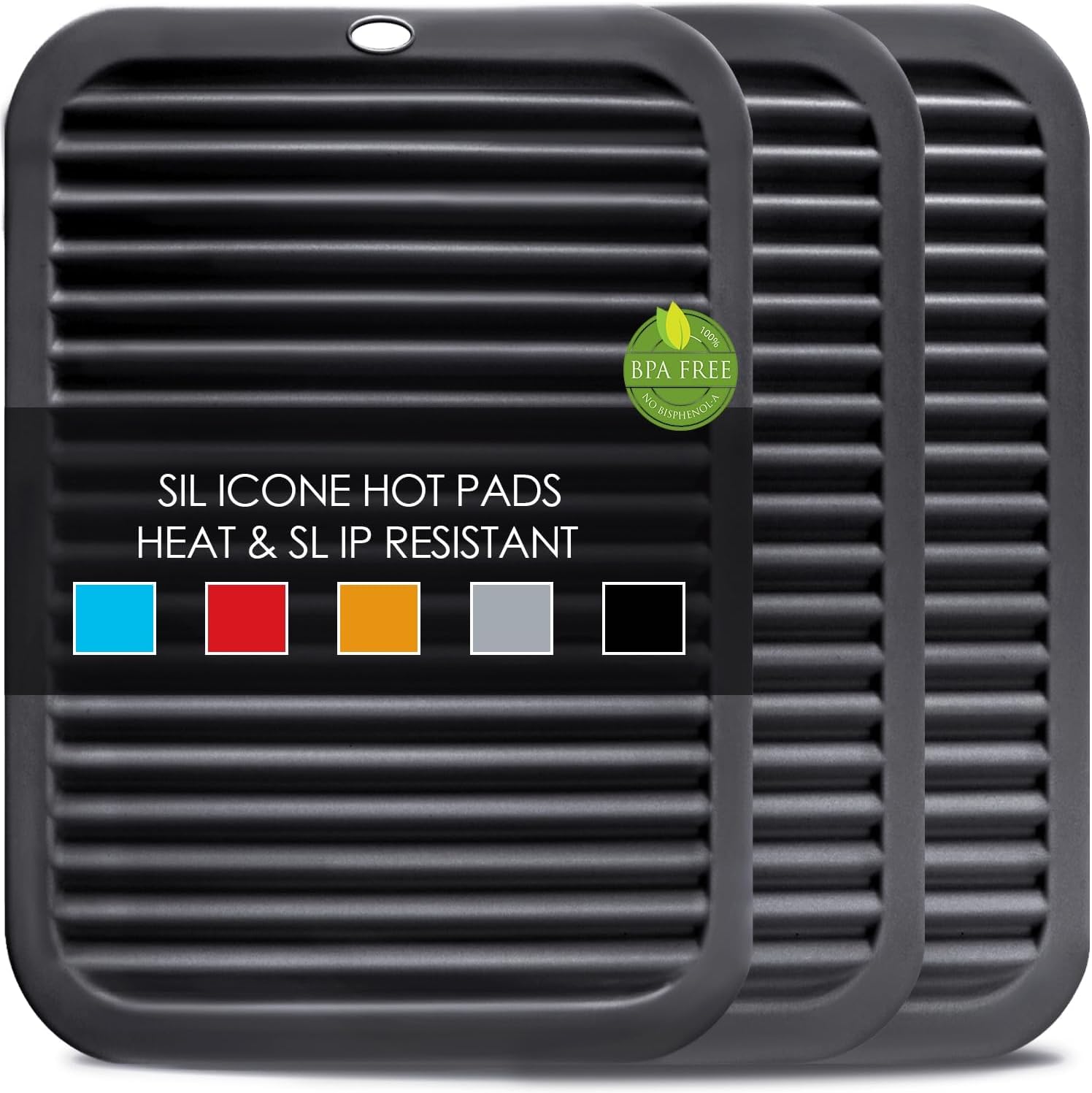 - 🥘FOOD-GRADE SILICONE & PERFECT SIZE: Our large black kitchen hot pads are made from 100% food grade silicone, BPA-free, leak-proof, nonstick, and lightweight. The 3 pack black silicone mat are super easy to grab a hot pan or dish. Size 9x11.6 inches, large enough for 9x13'' pans. And the black pot holders are perfect for air fryers and one other appliance that creates heat.