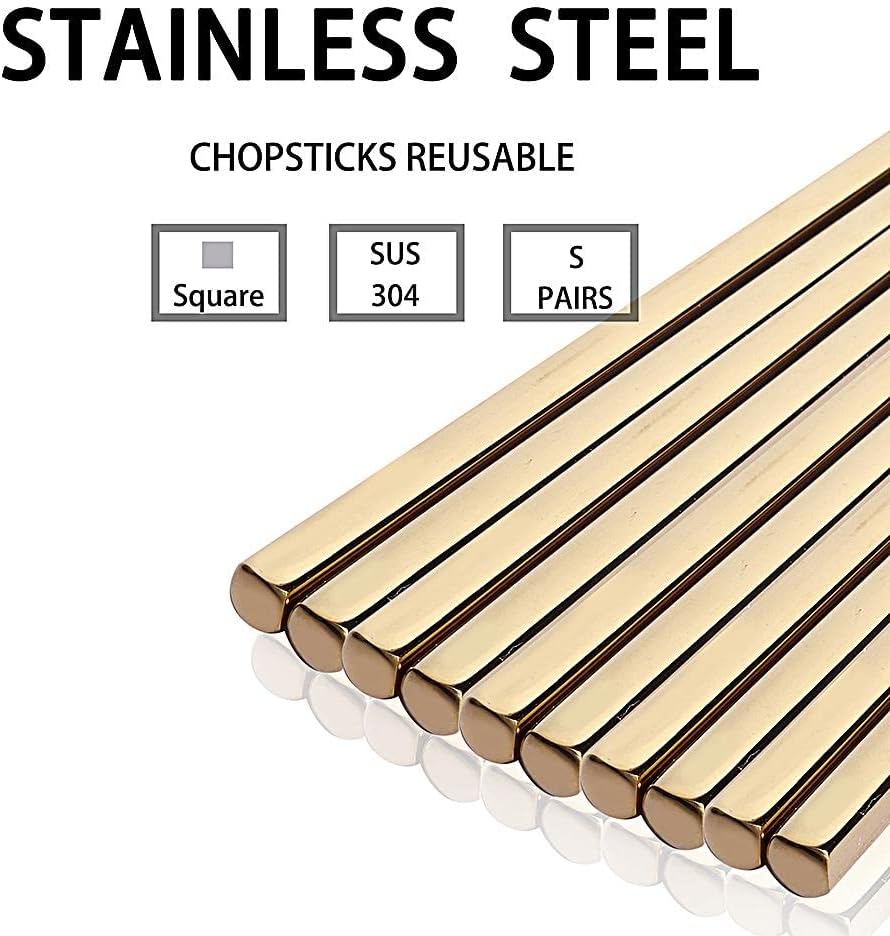 Metal Chopsticks Reusable Titanium Plated Stainless Steel Japanese Korean for Food & Cooking 9.5Inch Non-Slip for Beginners Square Laser 5 Pairs Gift Set
