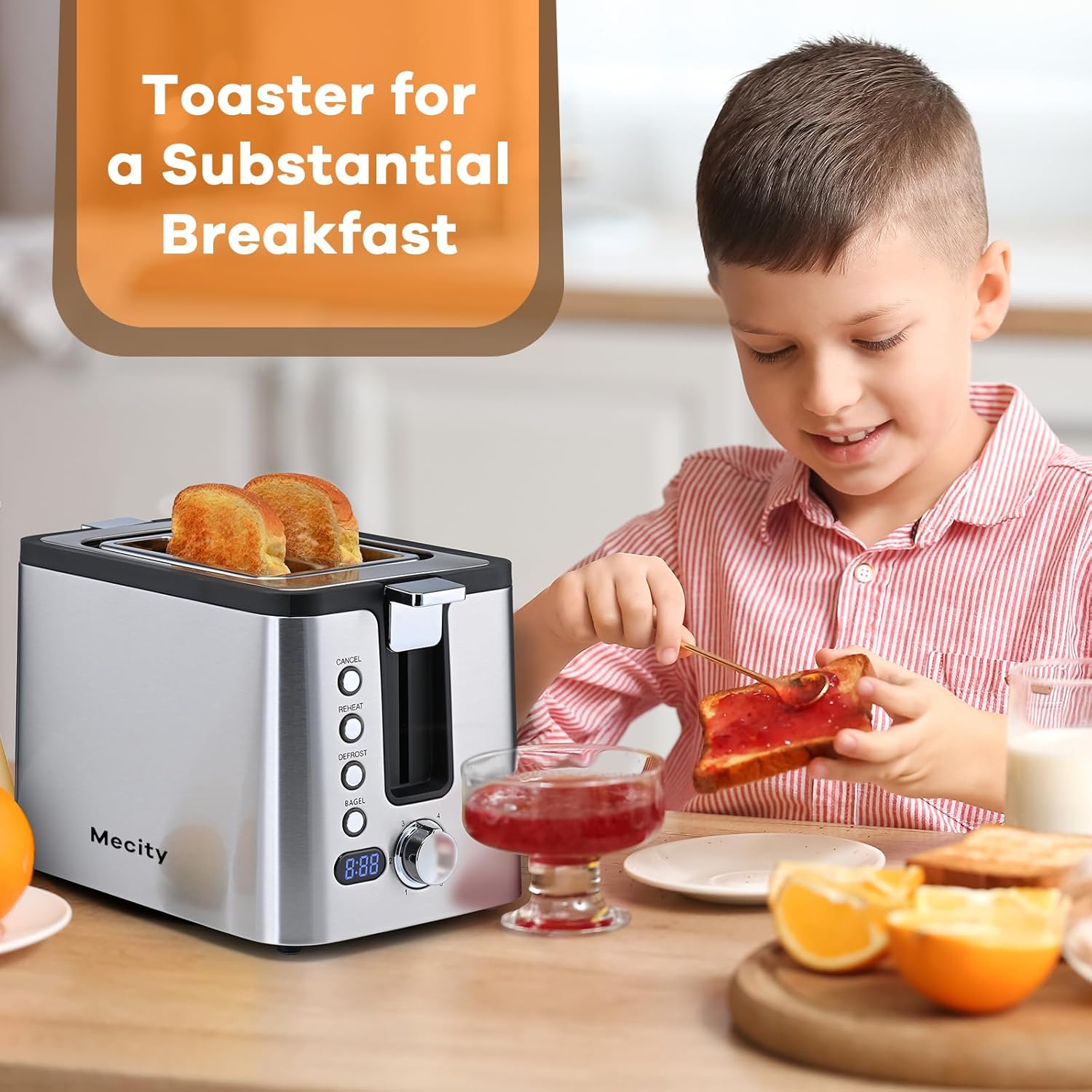 Mecity Toaster 2 Slice Stainless Steel with Countdown Timer, Bagel / Defrost / Reheat / Cancel Functions,Warming Rack, Removable Crumb Tray, 6 Browning Settings, Extra Wide Long Slots, Bread Toaster, 800 Watts