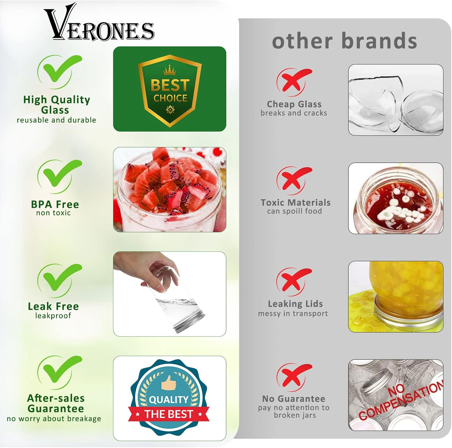 - EXCELLENCE IN QUALITY: Thick 8oz VERONES glass jars comes with food-safe, corrosion resistant lids - material meets certified safety standards.Each jar comes with a time tested airtight ceiling compound to help ensure a quality seal with each lid making them suitable for use in preserving and canning. Safe for the refrigerator and the freezer
