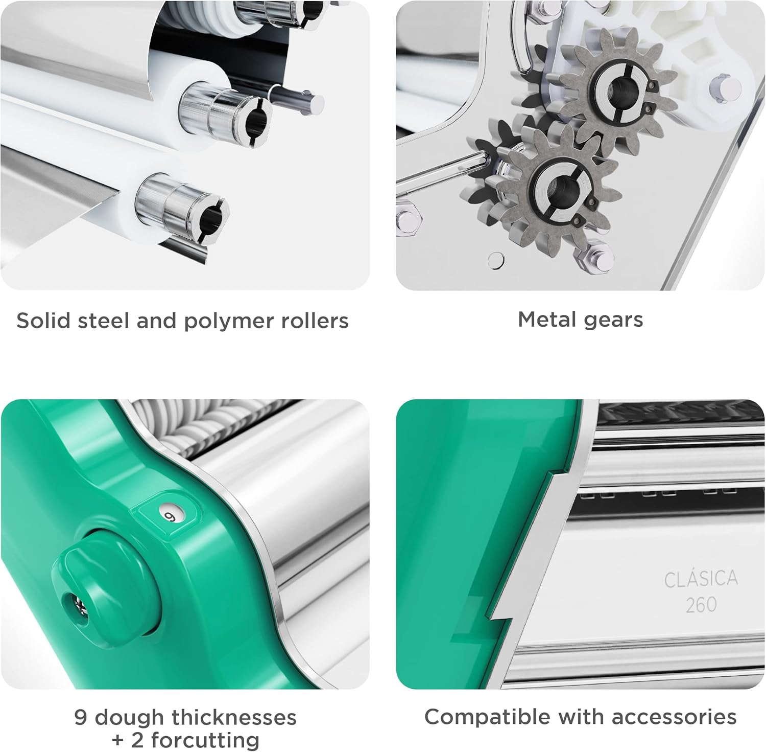 PASTALINDA Classic 260 Pasta Maker Machine, 26 cm Wide Rollers, 9 Thickness Positions, 2 Cutting Positions, Stainless Steel. Includes Reinforced Hand Crank And Two Clamps (Green)