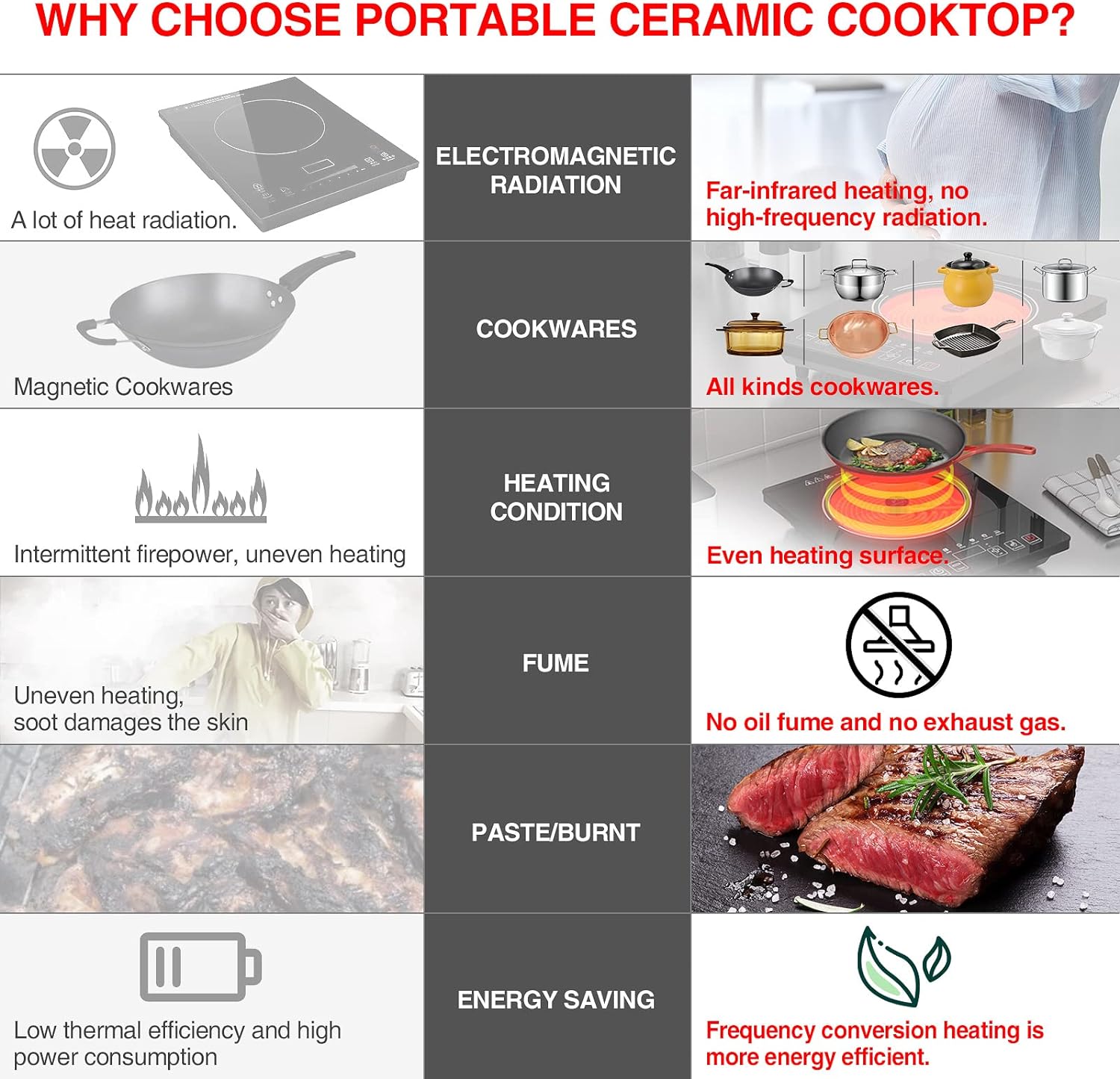 - 1800W Single Burner Electric Cooktop:This 1800W portable electric cooktop is suitable for US standard 110-120V voltage, plug and play. Ceramic electric stove without electromagnetic high-frequency radiation, better than induction cooktop,the elderly and pregnant women can use with confidence. Use ceramic electric stove cooking, no fumes, reduce the damage to the skin, to help you create a healthy kitchen environment.