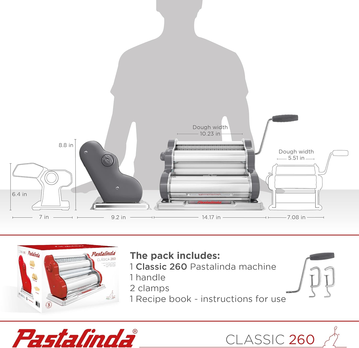 PASTALINDA Classic 260 Pasta Maker Machine, 26 cm Wide Rollers, 9 Thickness Positions, 2 Cutting Positions, Stainless Steel. Includes Reinforced Hand Crank And Two Clamps (Gray)