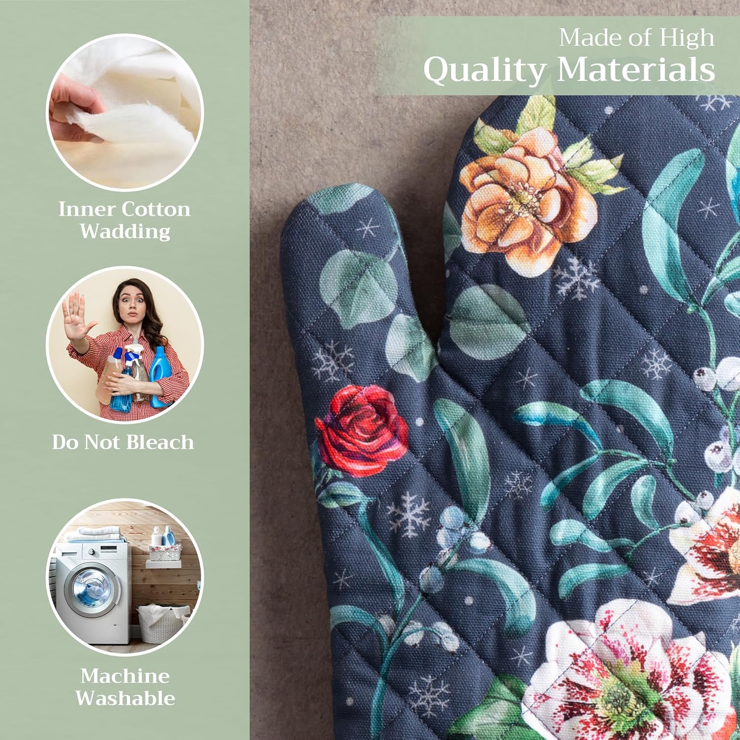 - 100% Quilted cotton: Crafted from thick, durable quilted cotton, this heat resistant oven mitt provides a soft feel, safe handling, and lasting performance. A must-have kitchen accessory for everyday cooking, roasting, or baking tasks