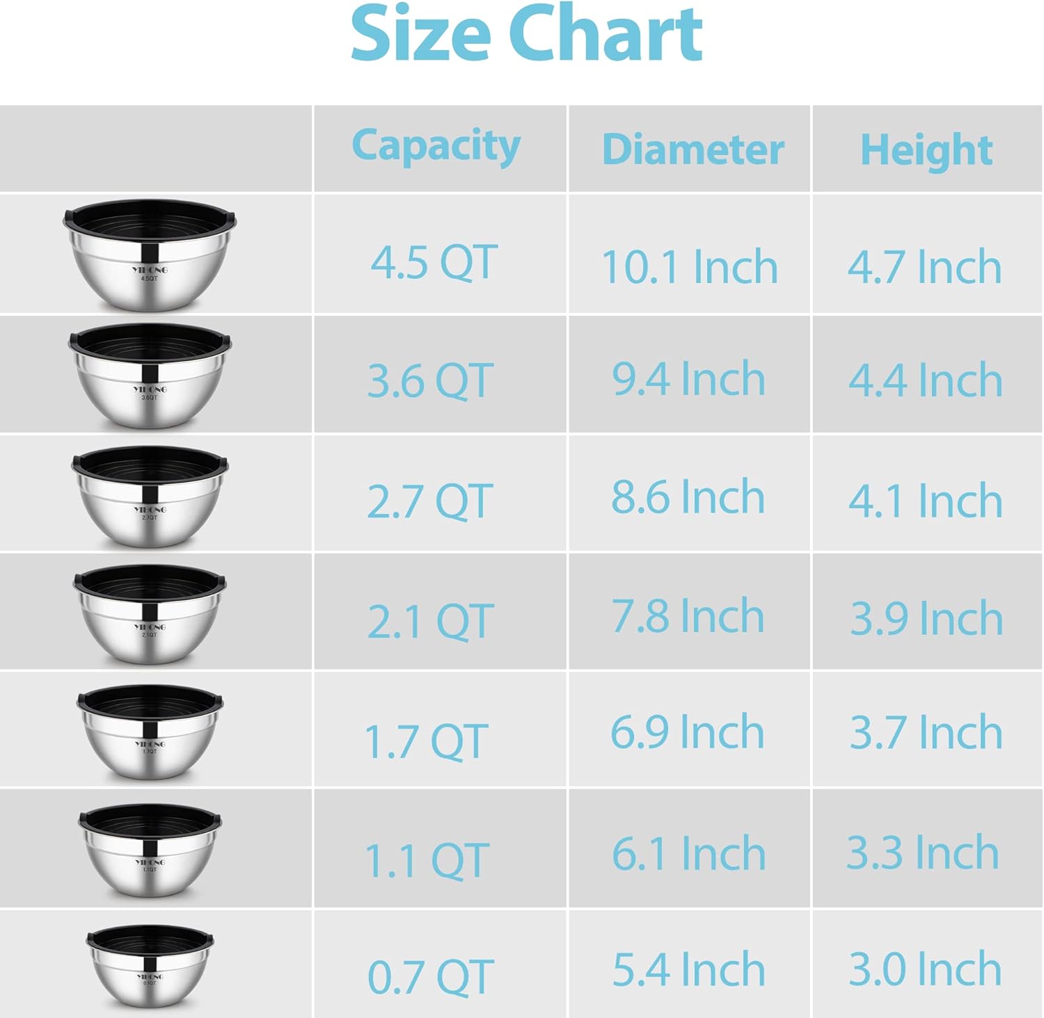 - Make Your Cooking Much Easier — Multi-purpose, stainless steel mixing bowl is essential to your everyday kitchen needs,7 different sizes of 4.5, 3.6, 2.7, 2.1, 1.7, 1.1, 0.7Qt will complement your cooking and make cooking much easier. Ideal for making a quick salad, preparing food, mixing batters, or storing and serving food.