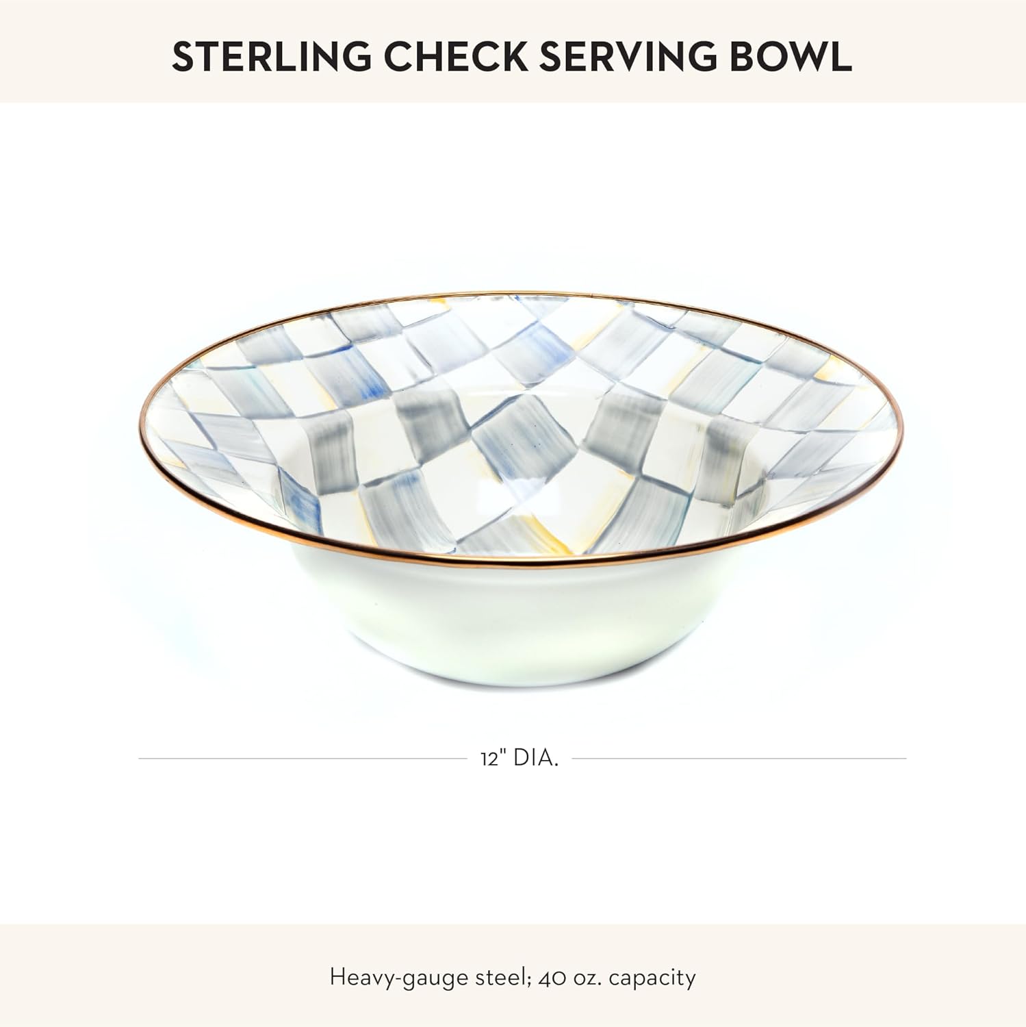 - ENTERTAINING & PARTY ESSENTIAL: The Sterling Check Enamel Serving Bowl features our subtle hand-painted gray-and-white checks over a hand-glazed steel underbody and has a bronzed stainless-steel rim.