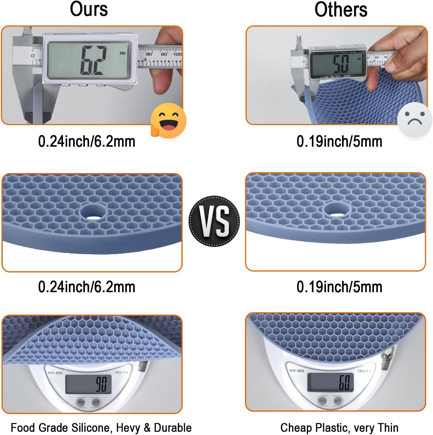 - 🎯 MULTIFUNCTIONAL TRIVETS - A must-have kitchen accessory. Save the valued kitchen space easily, each silicone trivet has a corner hole for convenient hanging storage and can use as a hot pad for countertops, blue spoon rest, utensil rest, hot pot holder, Jar opener, silicone table mat, silicone coaster, and garlic peeler.