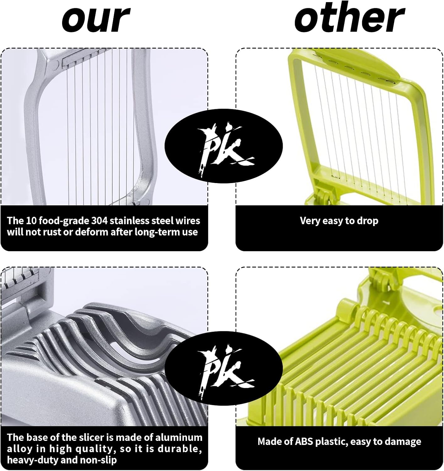 - Durable & Safe: The base of the slicer is made of aluminum alloy in high quality, so it is durable, heavy-duty and non-slip. It stands on your table stably and it won't slide while using. The 10 food-grade 304 stainless steel wires will not rust or deform after long-term use