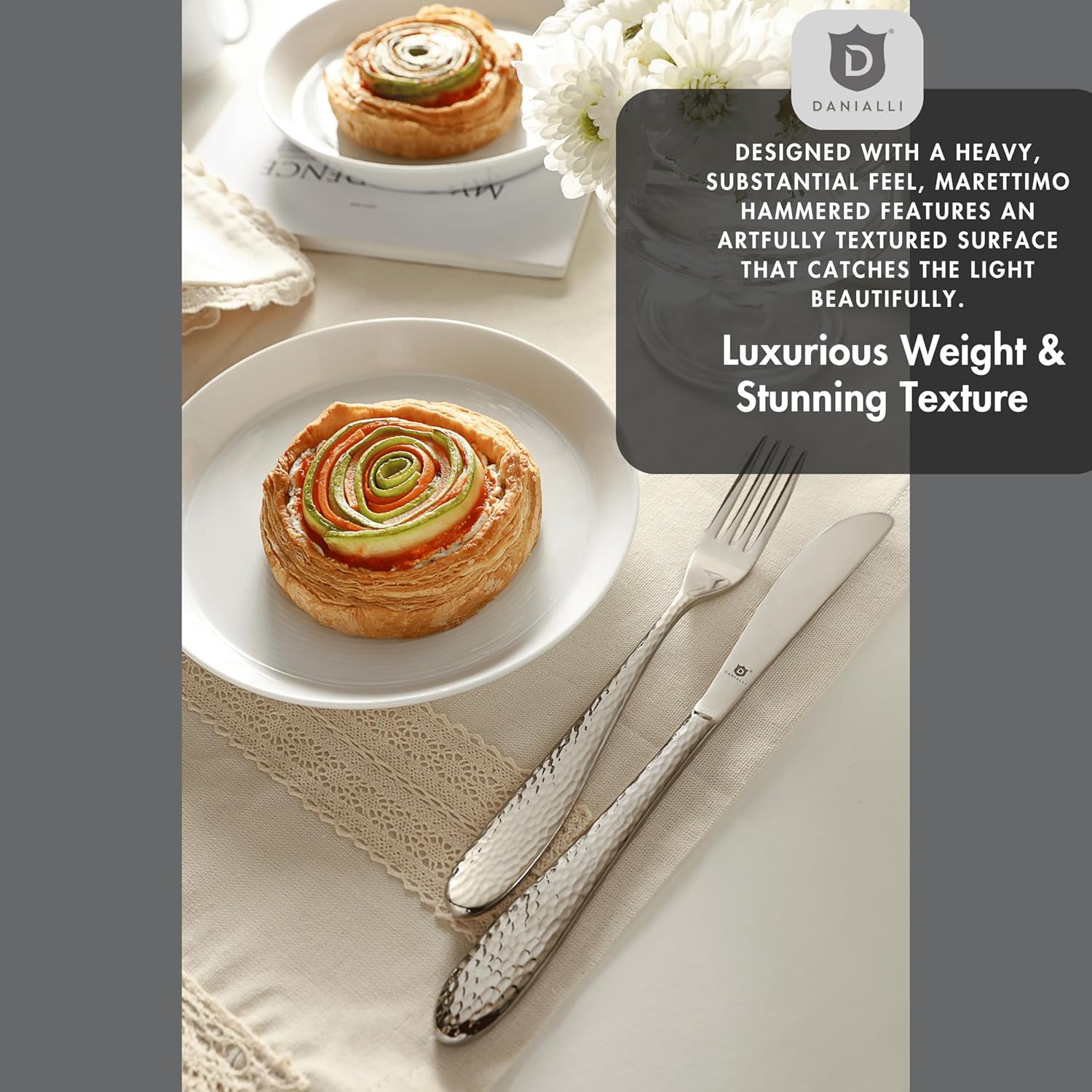 - Heaviest in DANIALLI's collection: Crafted with a hammered texture and heavy 18/10 stainless steel, each piece offers a solid well-balanced grip you’ll notice the moment you hold it.