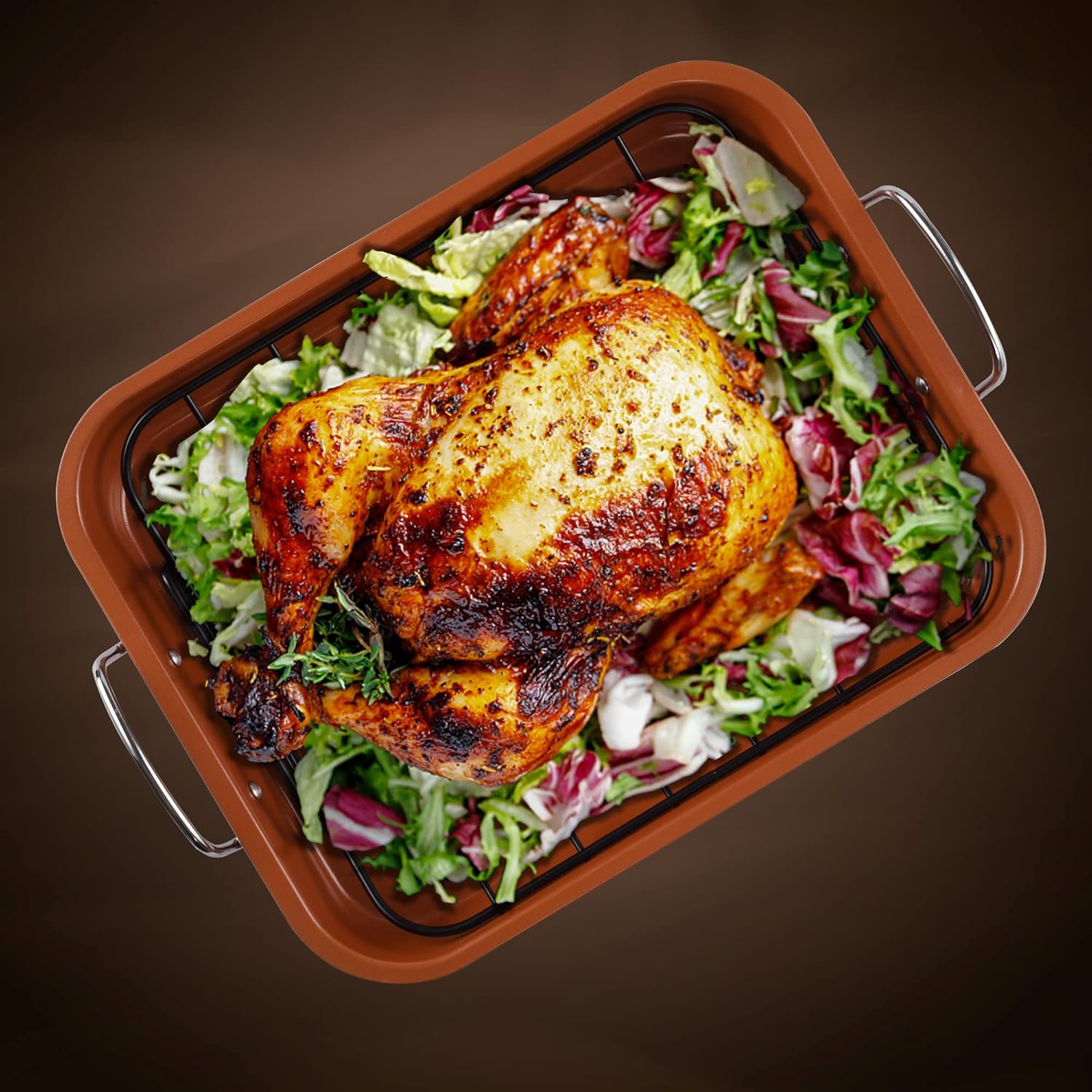 KitCom Nonstick Roasting Pan, Roaster with Cooling Rack and V-Rack - 16 Inch Rectangular Turkey Roaster Lasagna Pan for Easter, Thanksgiving & Christmas, Dishwasher Safe, Bronze
