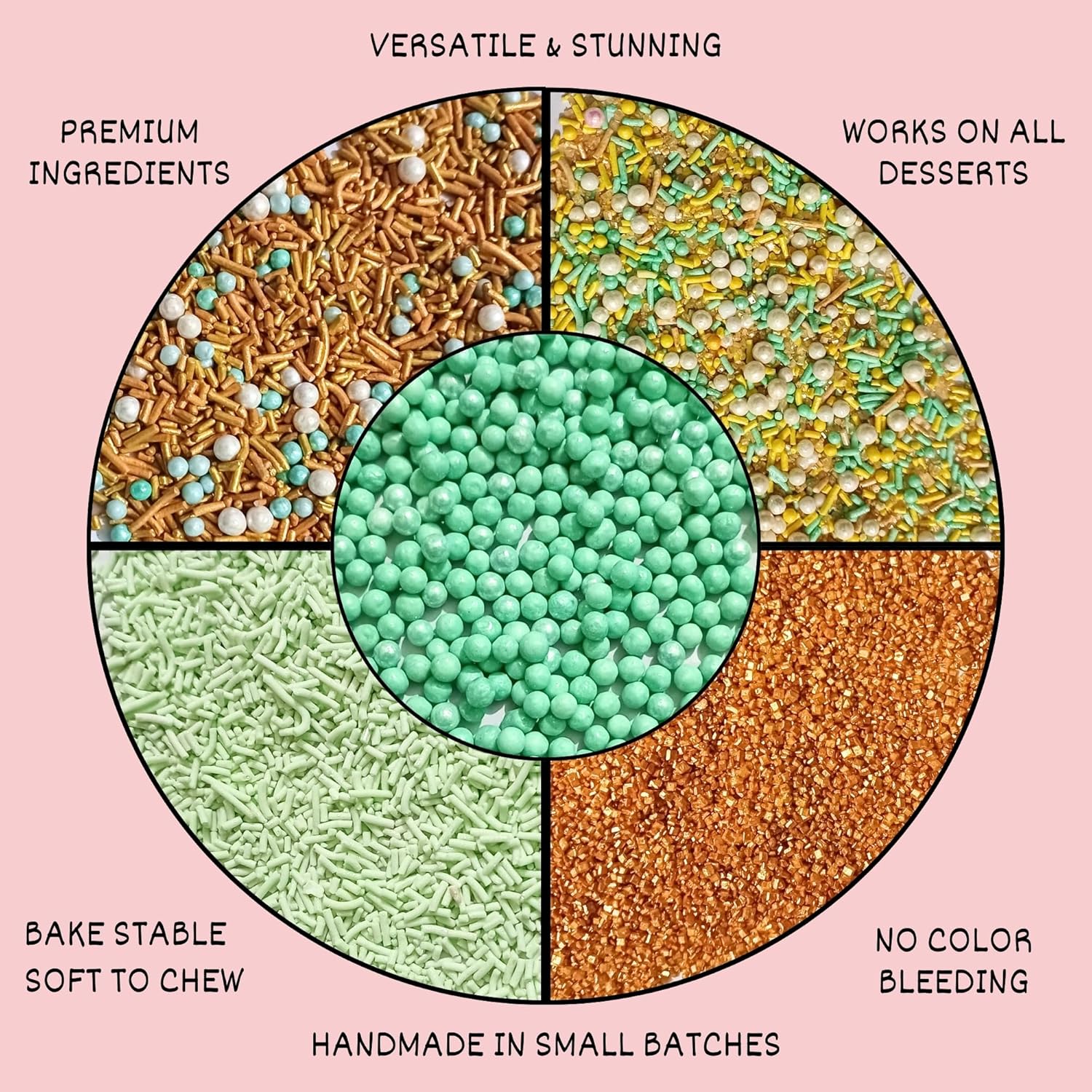 - Assorted Sprinkle Mix Pack (5 Varieties): Includes sky blue, yellow & white pearl dragees, jimmies, and sparkling sugar – perfect for creative dessert decorating.