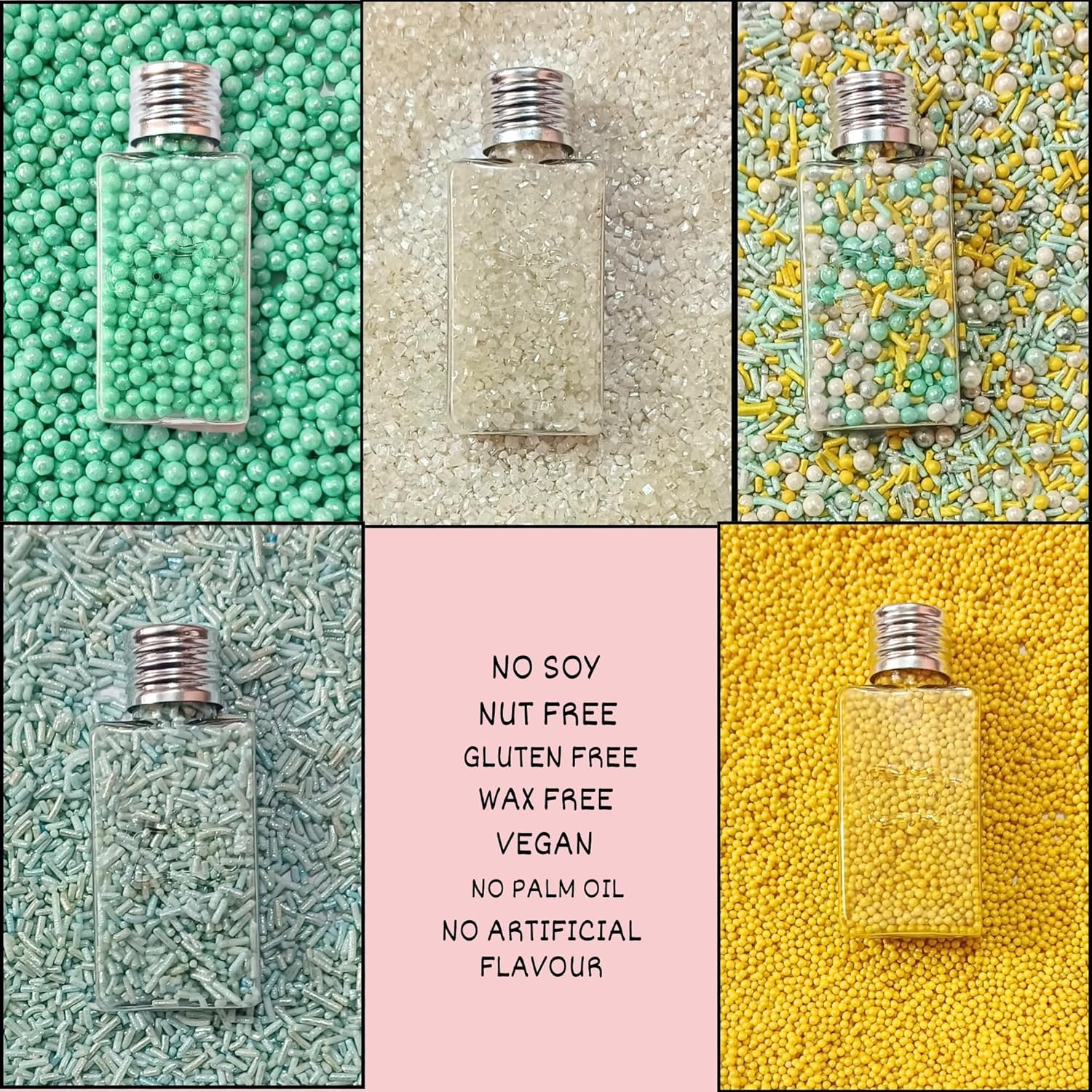 - Assorted Sprinkle Mix Pack (5 Varieties): Includes sky blue, yellow & white pearl dragees, jimmies, and sparkling sugar – perfect for creative dessert decorating.
