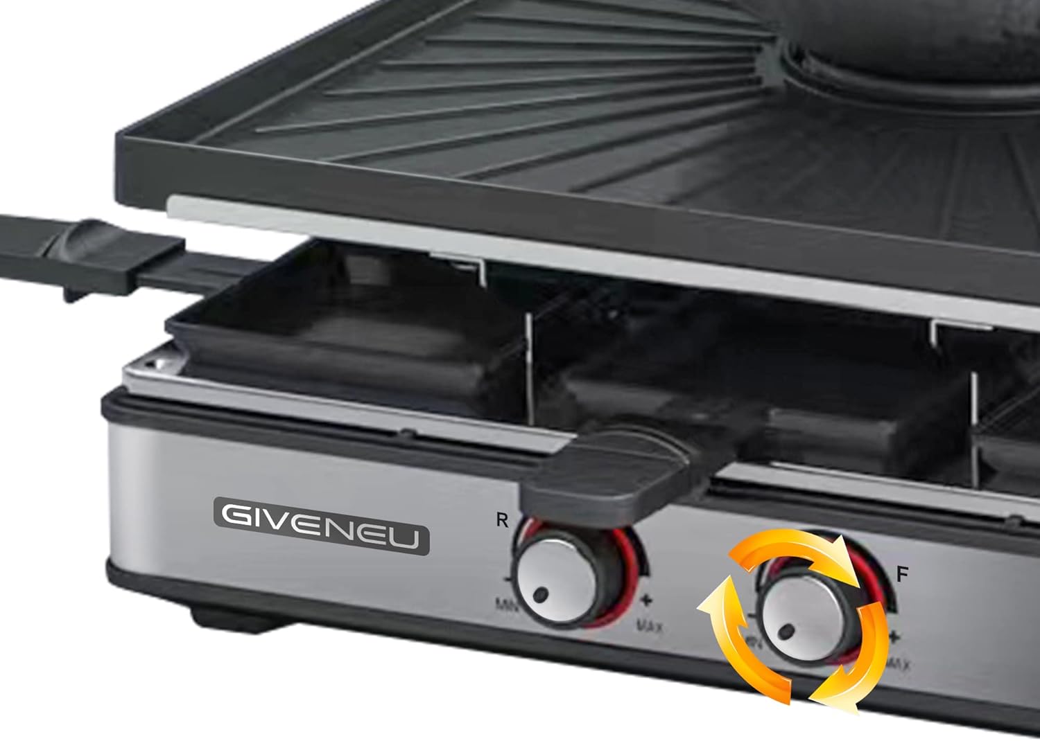 - 2-in-1 Raclette & Fondue Combo – The GIVENEU Electric Fondue Pot Set combines a 600ml brushed stainless steel fondue pot with a tabletop raclette grill plate. Perfect for up to 8 people, this versatile combo lets you melt cheese, heat chocolate, prepare broth, and grill meats, seafood, and vegetables — all at once.