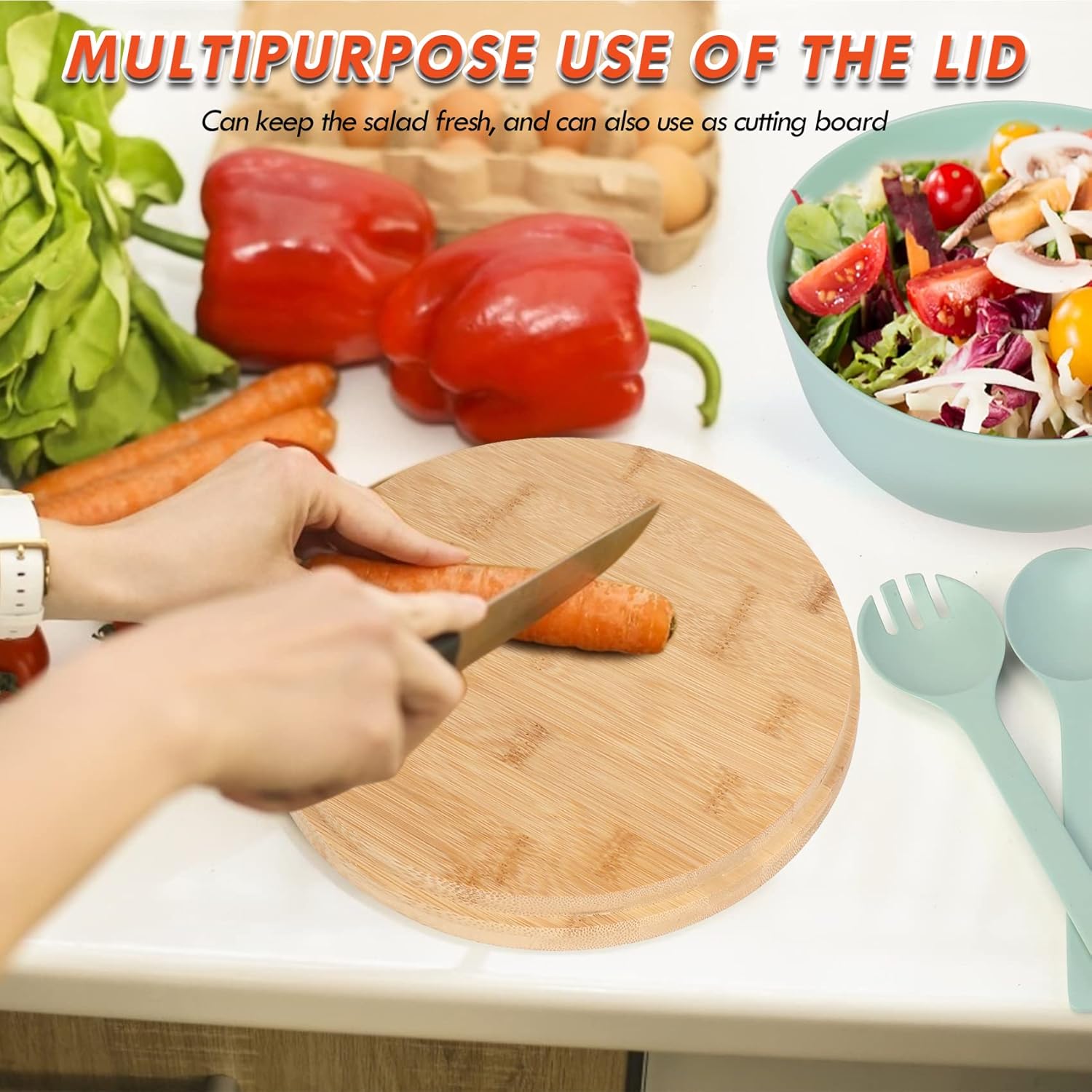 - 〖MULTIPLE USE OF THE LID〗: The solid bamboo lid can be used as chopping board for easy preparation. Owing this salad bowl will not only make your work for food more convenient, but also make your kitchen more elegant.