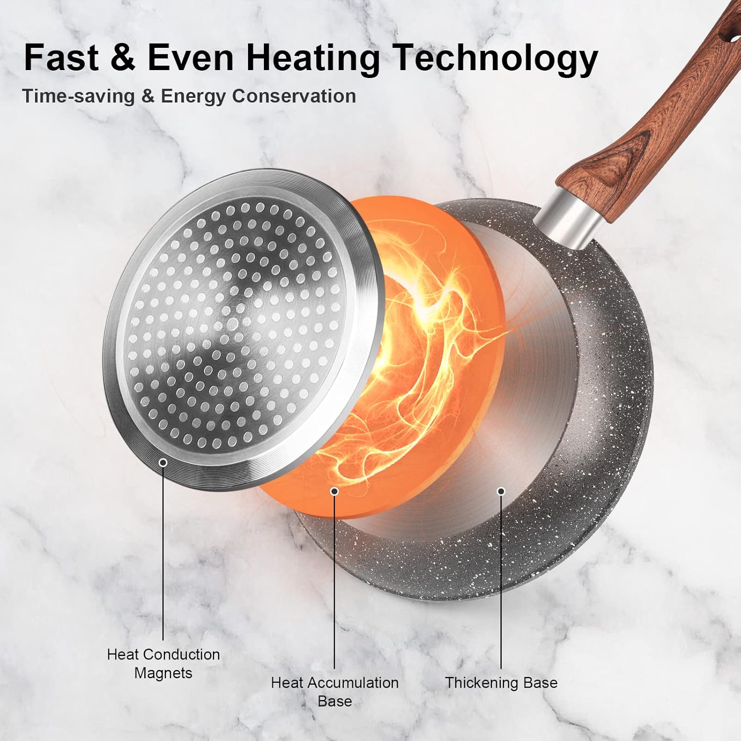 - 【Versatile Cooking Pan Set】High Magnetic conduction stainless steel base allows our kitchen cookware sets to work on all cooktops, including gas, ceramic, electric, halogen or induction stoves. Time to replace your aging or worn out cookware set with our premium granite cookware set non toxic